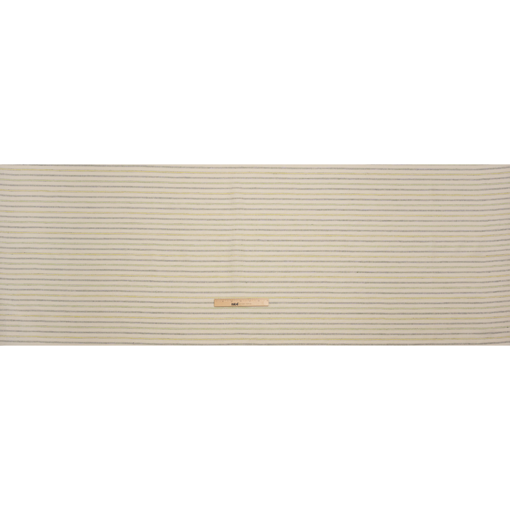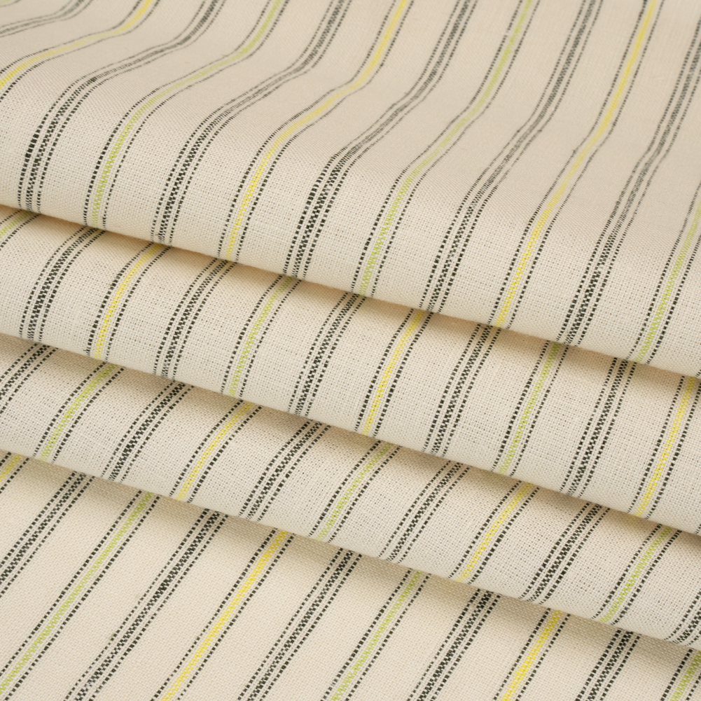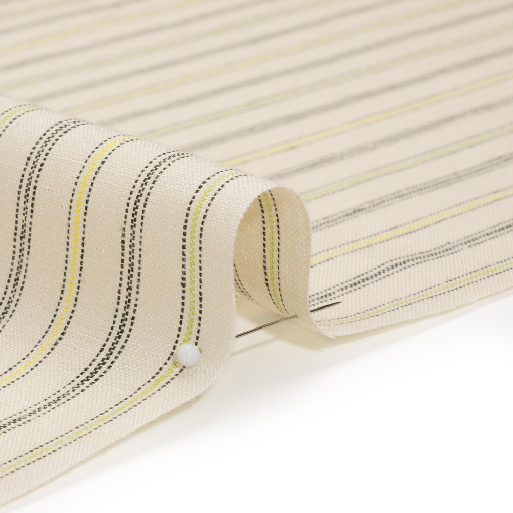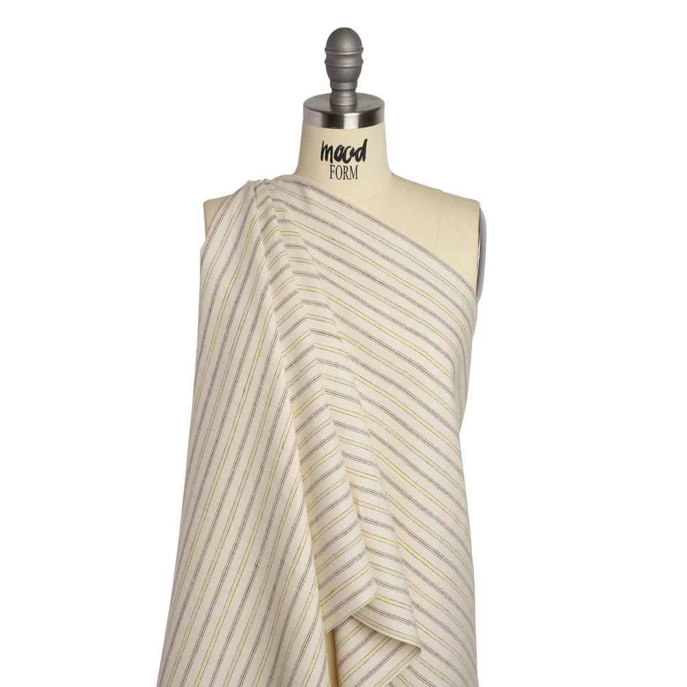 Walk the line of simple elegance with this Cream, Green and Yellow Ticking Stripes Medium-Weight Linen Woven, featuring a medium weight, slightly slubbed, cool hand and crisp drape.Suggested Projects: Shirts, Skirts, Pants, DressesContent: 100% LinenStretch: NoneOpacity: Slightly TranslucentCream, green, and yellow stripes complement the easy-going feel of linen, a warm-weather fabric that will become a vacation staple, workplace go-to, and everything in between. The face is slightly slubbed and the drape is crisp. Naturally moisture-wicking and of medium weight, this linen will make steamy summer days a breeze. Create relaxed button-downs, long skirts, flowy pants, and more! As it is slightly translucent, a lining may be desired depending on the project.