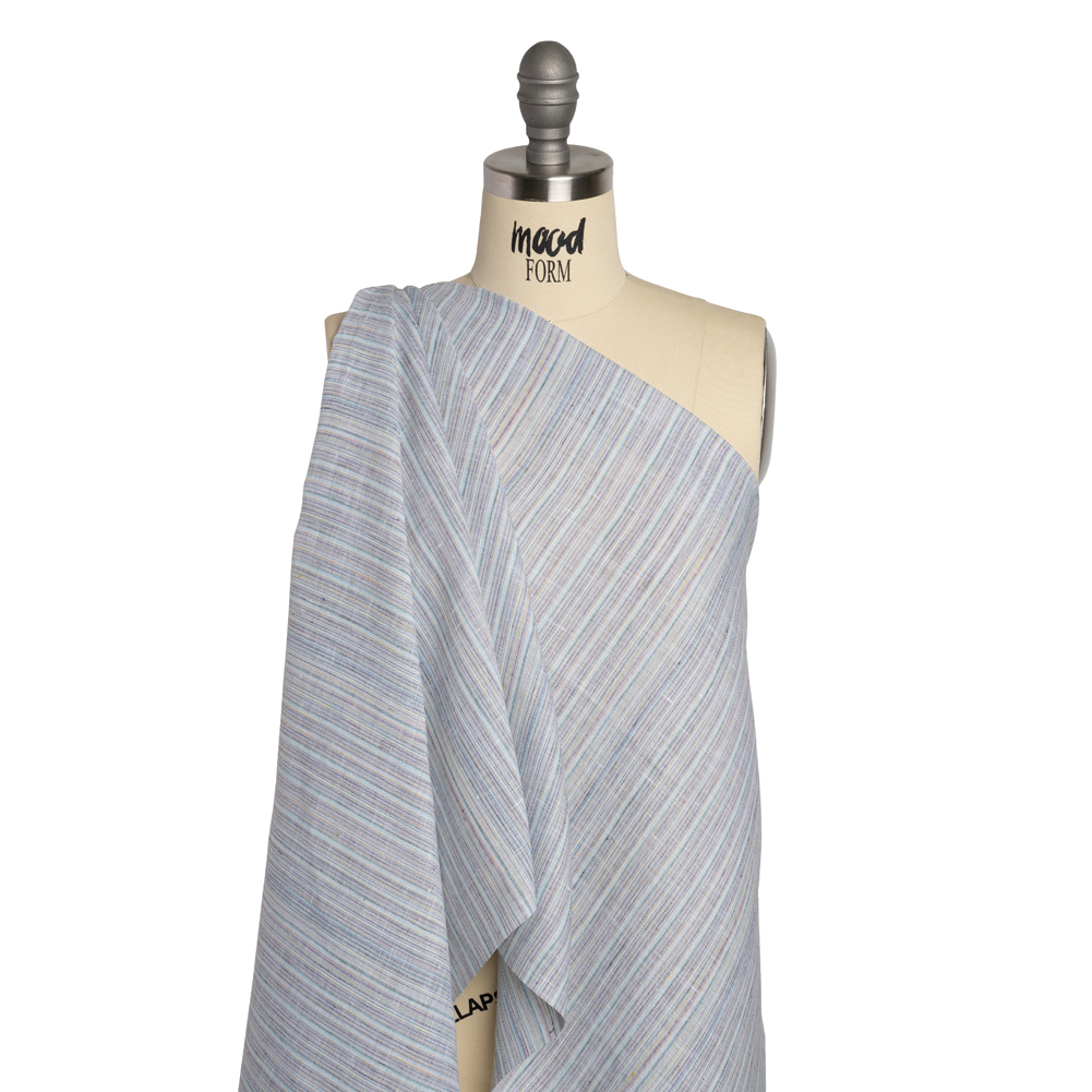 A tiger can’t change its stripes, and neither should you with this Pastel Blue and Multicolor Stripes Medium-Weight Linen Woven, featuring a medium weight, slightly slubbed, cool hand and crisp drape.Suggested Projects: Shirts, Skirts, Pants, DressesContent: 100% LinenStretch: NoneOpacity: Slightly TranslucentThin pastel blue and multicolor stripes complement the easy-going feel of linen, a warm-weather fabric that will become a vacation staple, workplace go-to, and everything in between. The face is slightly slubbed and the drape is crisp. Naturally moisture-wicking and of medium weight, this linen will make steamy summer days a breeze. Create relaxed button-downs, long skirts, flowy pants, and more! As it is slightly translucent, a lining may be desired depending on the project.