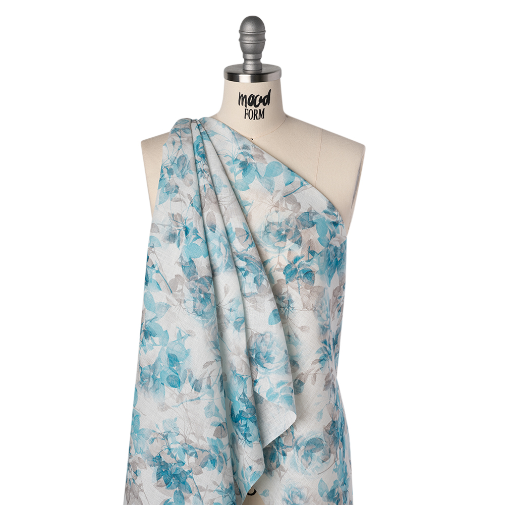 Let your creativity drift in a cool breeze with the Aqua and Gray Airy Leaves on White Medium Weight Linen Woven Print—a refreshing choice for breezy, effortless silhouettes.Suggested Projects: Shirts, Skirts, Pants, DressesContent: 100% LinenStretch: NoneOpacity: Translucent Layered with blue and gray leafy forms and faded gray roses, this print captures the gentle movement of radiant light as it peeks through an airy canopy. With a crisp hand, breathable weave, and semi-structured drape, this linen suits tailored shirts, wide-leg trousers, summer frocks, or softly gathered skirts. The translucent background welcomes creative layering or lightweight linings for your preferred level of coverage.