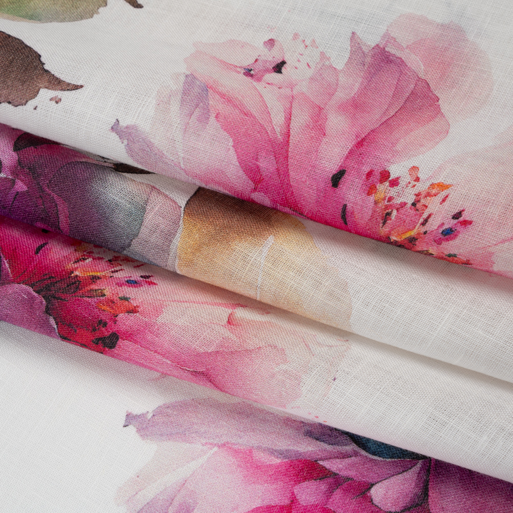 Rosy and radiant, this Fuschia Pink on White Wild Roses Medium Weight Linen Woven Print brings garden-party glamour to everyday wear.Suggested Projects: Shirts, Skirts, Pants, DressesContent: 100% LinenStretch: NoneOpacity: Translucent Soft blooms with hues that beautifully bleed into each other are scattered across a breathable linen base. This fabric blends natural charm with refined ease. It offers a lightly crisp hand and a moderate drape, ideal for relaxed button-downs, warm-weather trousers, breezy skirts, or easygoing summer dresses. Due to its translucent quality, you may want to add a lining for more coverage, depending on your project.