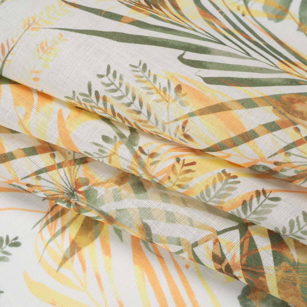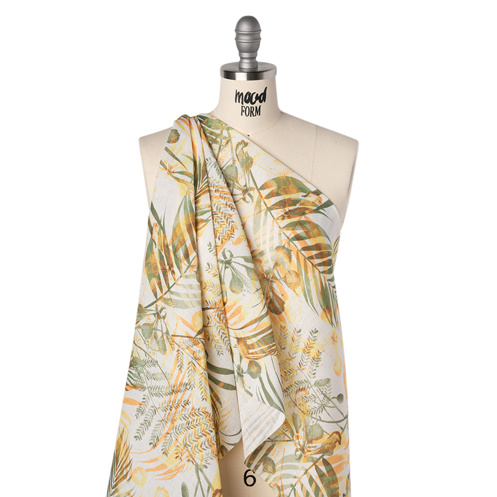 Palm your worries away with this Sage Green, Orange, and White Elegant Palm Silhouettes Medium Weight Linen Woven Print—a breezy pick for warm-weather staples.Suggested Projects: Shirts, Skirts, Pants, DressesContent: 100% LinenStretch: NoneOpacity: Translucent Set against a white base, overlapping palms in soft sage green and citrusy orange create a dreamy layered effect with sheer transitions that let every detail shine through. This linen offers a crisp hand, breathable feel, and moderate drape—ideal for button-up tops, midi skirts, drawstring trousers, and flowy dresses. Its translucent weave encourages creative layering or light linings depending on your project needs.