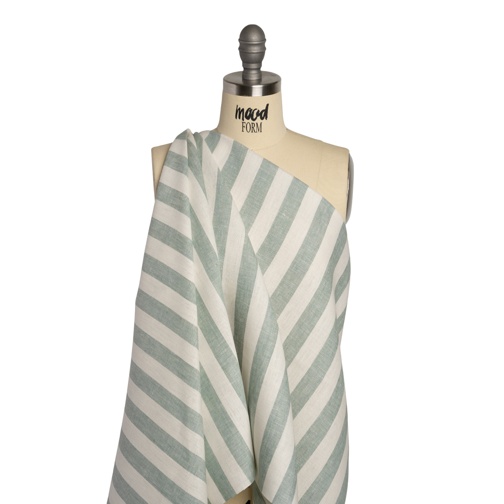 Relaxing escapades aren’t the same without this Sage Green and Cream Awning Stripes Medium-Weight Linen Woven, featuring a slightly slubbed hand and fluid drape.Suggested Projects: Shirts, Skirts, Pants, DressesContent: 100% LinenStretch: NoneOpacity: Slightly TranslucentSage green and cream awning stripes run across this woven, complementing the easy-going feel of linen, a warm-weather fabric that will become a summer staple, workplace go-to, and everything in between. The face is slightly slubbed and the drape is fluid. Naturally moisture-wicking and of medium weight, this linen will make steamy summer days a breeze. Create relaxed button-downs, pleated skirts, overall dresses, and more! As it is slightly translucent, a lining may be desired depending on the project.