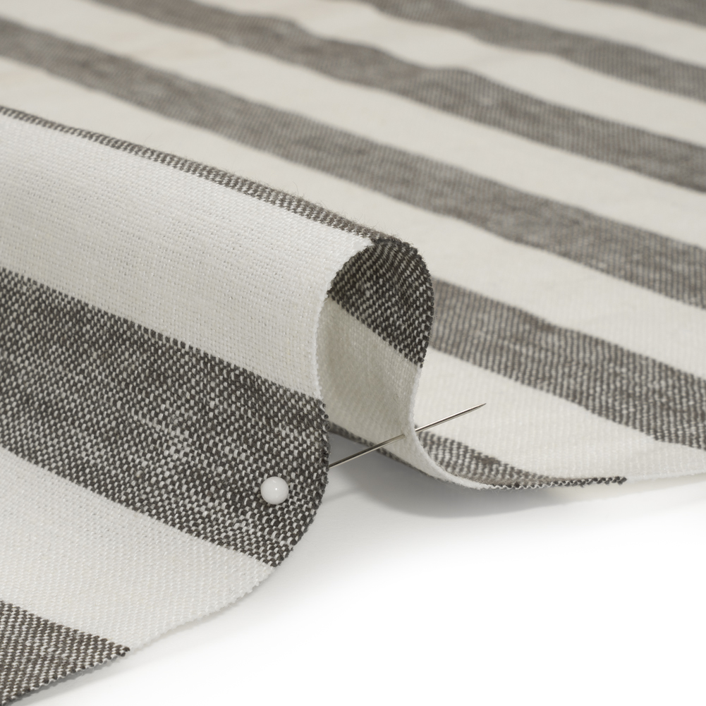 Escape the city and out into the countryside with this Smoke Gray and Cream Awning Stripes Medium-Weight Linen Woven, featuring a slightly slubbed hand and fluid drape.Suggested Projects: Shirts, Skirts, Pants, DressesContent: 100% LinenStretch: NoneOpacity: Slightly TranslucentSmoke gray and cream awning stripes run across this woven, complementing the easy-going feel of linen, a warm-weather fabric that will become a summer staple, workplace go-to, and everything in between. The face is slightly slubbed and the drape is fluid. Naturally moisture-wicking and of medium weight, this linen will make steamy summer days a breeze. Create relaxed button-downs, pleated skirts, overall dresses, and more! As it is slightly translucent, a lining may be desired depending on the project.