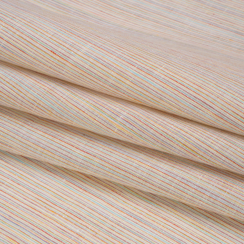 You’ll find this White and Rainbow Striations Medium-Weight Linen Woven at the end of the rainbow, featuring a medium weight, slightly slubbed, cool hand and crisp drape.Suggested Projects: Shirts, Skirts, Pants, DressesContent: 100% LinenStretch: NoneOpacity: Slightly TranslucentThin white and rainbow stripes complement the easy-going feel of linen, a warm-weather fabric that will become a vacation staple, workplace go-to, and everything in between. The face is slightly slubbed and the drape is crisp. Naturally moisture-wicking and of medium weight, this linen will make steamy summer days a breeze. Create relaxed button-downs, long skirts, flowy pants, and more! As it is slightly translucent, a lining may be desired depending on the project.