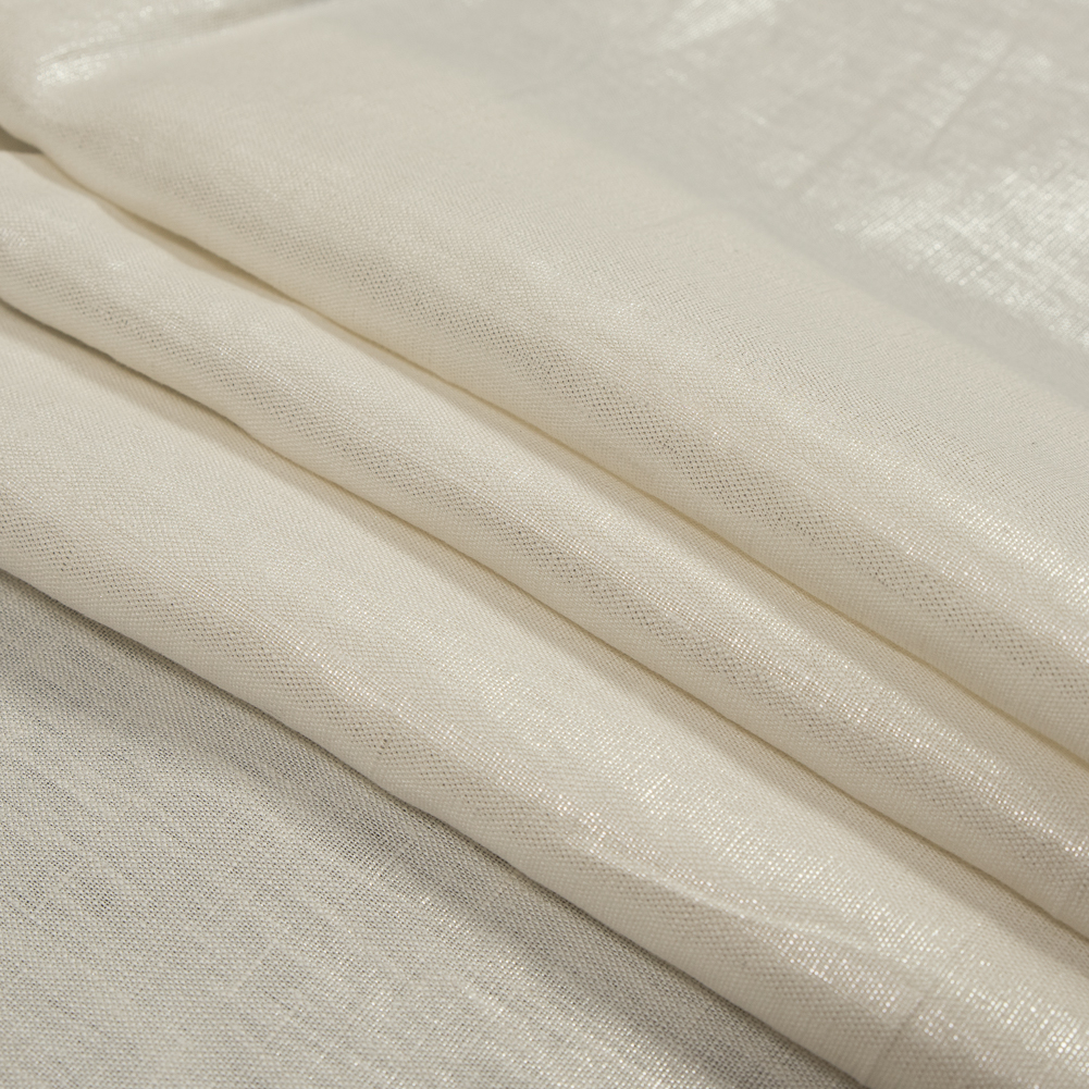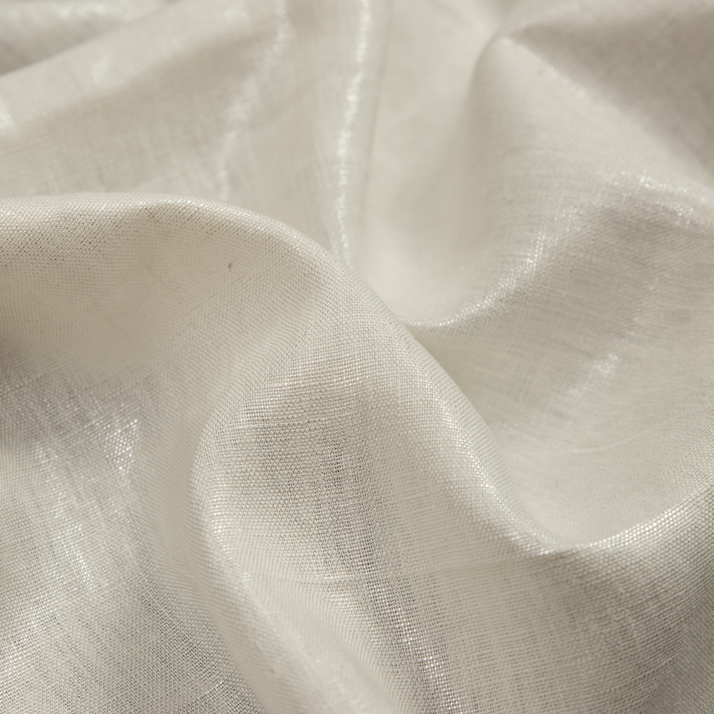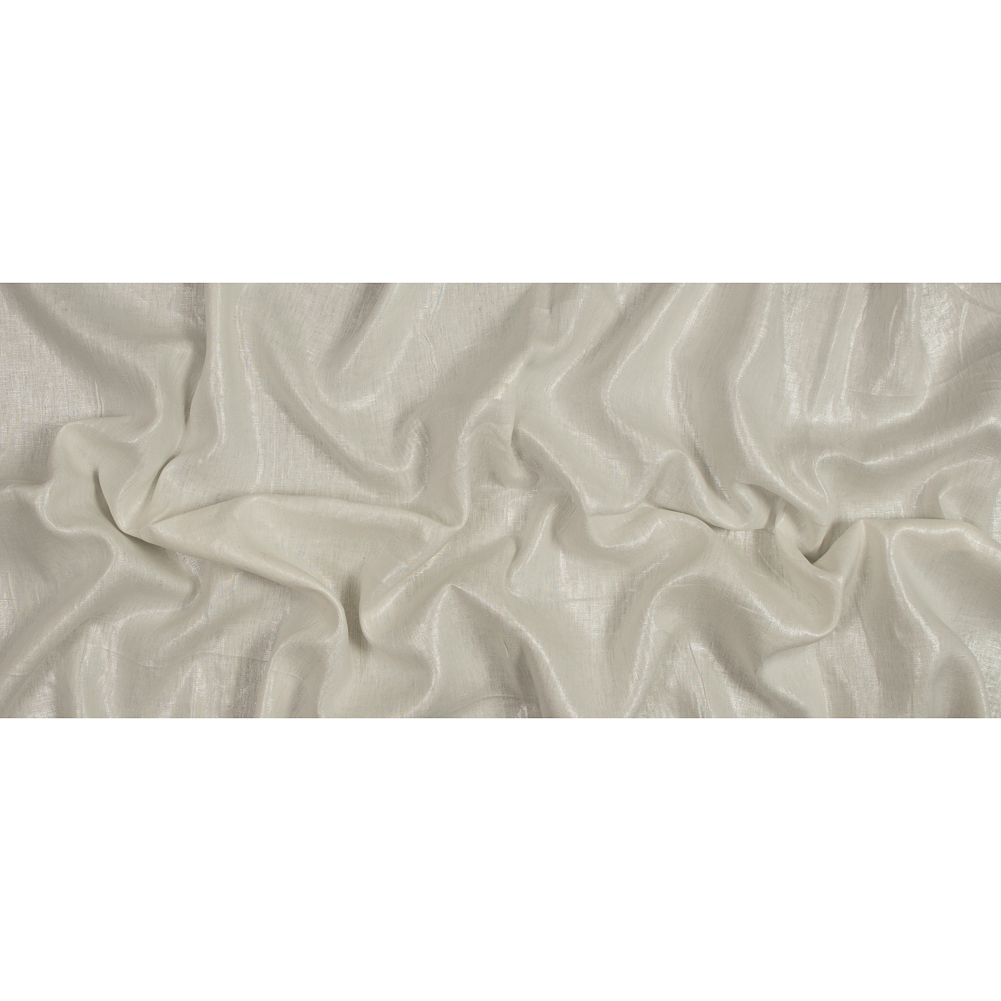 A chic contemporary look at what linen could be, take home this one-of-a-kind Ivory Medium Weight Linen Woven with a Metallic Silver Foil Topcoat. Linen is one of the best fabrics for spring and summer due to its soft, breathable and airy nature. This specific collection gives the natural look the fiber inherently presents a shimmering dose of metallic shine. Its billowing drape creates wrap dresses, wide leg trousers and kaftan tunics with ease. Thin with a medium weight, it is the perfect choice for a spring day or summer night. Translucent, insert a lining for more opacity. Note: The maximum washing temperature for this linen is 30 degrees Celsius. Do not bleach or tumble dry this fabric. Iron at a maximum sole plate temperature of 110 degrees Celsius; steam ironing may cause irreversible damage. This fabric can be dry cleaned in all solvents.