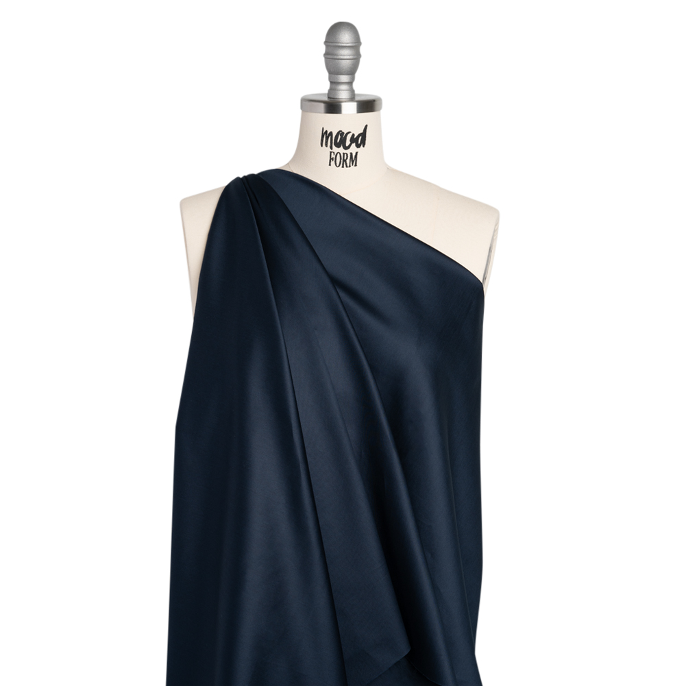 Live in luxury in this Dark Navy Mercerized Organic Egyptian Cotton Shirting. Featuring a thin, lightweight nature and crisp, cool hand thanks to its 100% cotton makeup, it’s ideal for high-quality wardrobe staples.Suggested Projects: Shirts, Skirts, DressesContent: 100% CottonStretch: No StretchOpacity: Mostly OpaqueIn need of some high-quality fabric? Mercerized cotton fabrics are far from your basic cotton fabrics, as they are finished with a special chemical treatment that increases luster, dye absorption, and tear strength while reducing fabric shrinkage. Thin and lightweight, it has a crisp, cool hand and a stiff but flexible drape that allows you to get creative with silhouettes. Turn it into classic button downs, as well as smart billowy skirts, blouses, and dresses. Though mostly opaque, a lining is suggested for more opacity and structure.