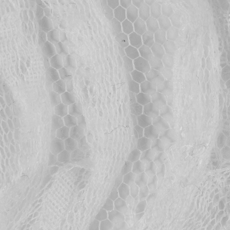 Here is a beautiful, light-weight, white mesh lace with ruffled strips adding a contemporary twist to a novelty lace. This beautiful lace is complete with ruffled rows of lace stitched in a waving pattern atop the lace base creating an overall dimensional design. Laying at 51" in width and with a nice give in the weft, this lace has an easy drape and could make anything from a formal gown to a slip dress.