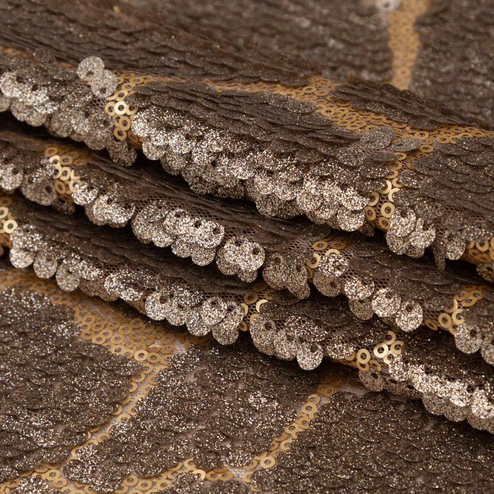 More dazzling than fine-cut diamonds, our shimmering Metallic Bronze Sequin “Splotches” on Dark Beige Mesh takes over the scene.