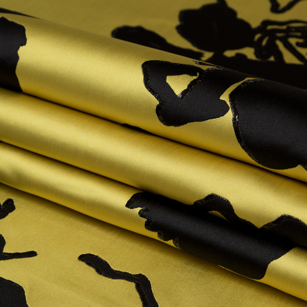 Light and dark collide on the surface of Mood’s Metallic Black and Blazing Yellow Abstract Luxury Jacquard Lame, black flowers battling the bold and bright yellow that surrounds it.