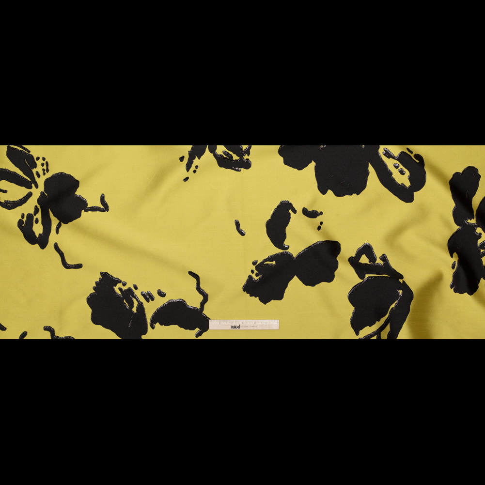 Light and dark collide on the surface of Mood's Metallic Black and Blazing Yellow Abstract Luxury Jacquard Lame, black flowers battling the bold and bright yellow that surrounds it. Inky and obscure, flowers reflect light on the luminescent face like a Rorschach test of happy memories, smooth and slippery in hand. Fashion full-skirted ball gowns, powerful long-line jackets, and wide-leg trousers with matching blazers using its voluminous and structured drape that billows like a ship's sails on its way out to sea. Without stretch and completely opaque, a lining is recommended for increased comfort. Please note, this fabric weighs 212 GSM.