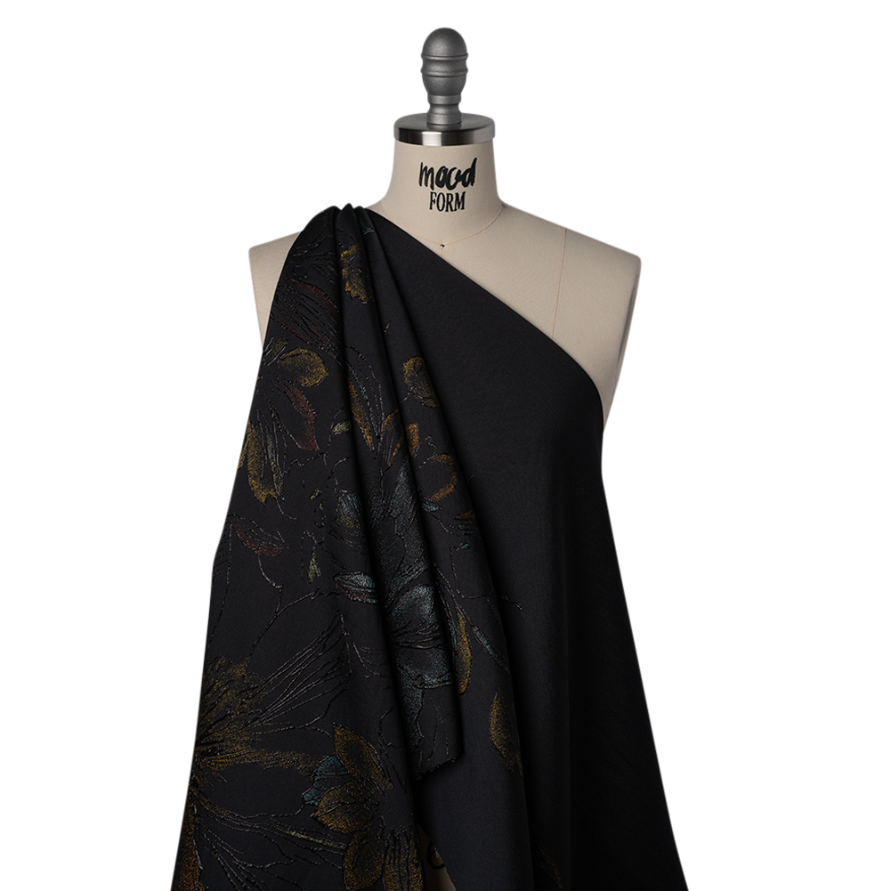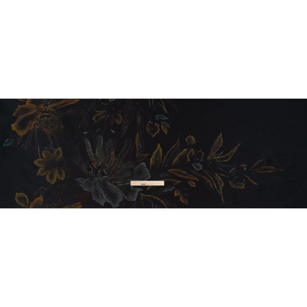 This Golden Yellow Delicate Flowers Metallic Acetate and Polyester Brocade is a delicate balance of elegance and ease—featuring a sleek hand and voluminous drape.Suggested Projects: Gowns, Skirts, Jackets, PantsContent: 58% Acetate, 42% PolyesterStretch: NoneOpacity: OpaqueGive the gift of an everlasting bouquet, where delicate raised flowers unfurl in golden yellow, aqua blue, orange, and red, their petals glowing against a rich black backdrop. Its sleek, soft hand contrasts beautifully with the textured florals, while a voluminous drape makes it ideal for sweeping gowns, full circle skirts, sharp tailored sets, and beyond. Though opaque, a lining can be added for enhanced structure and a polished, elegant finish.