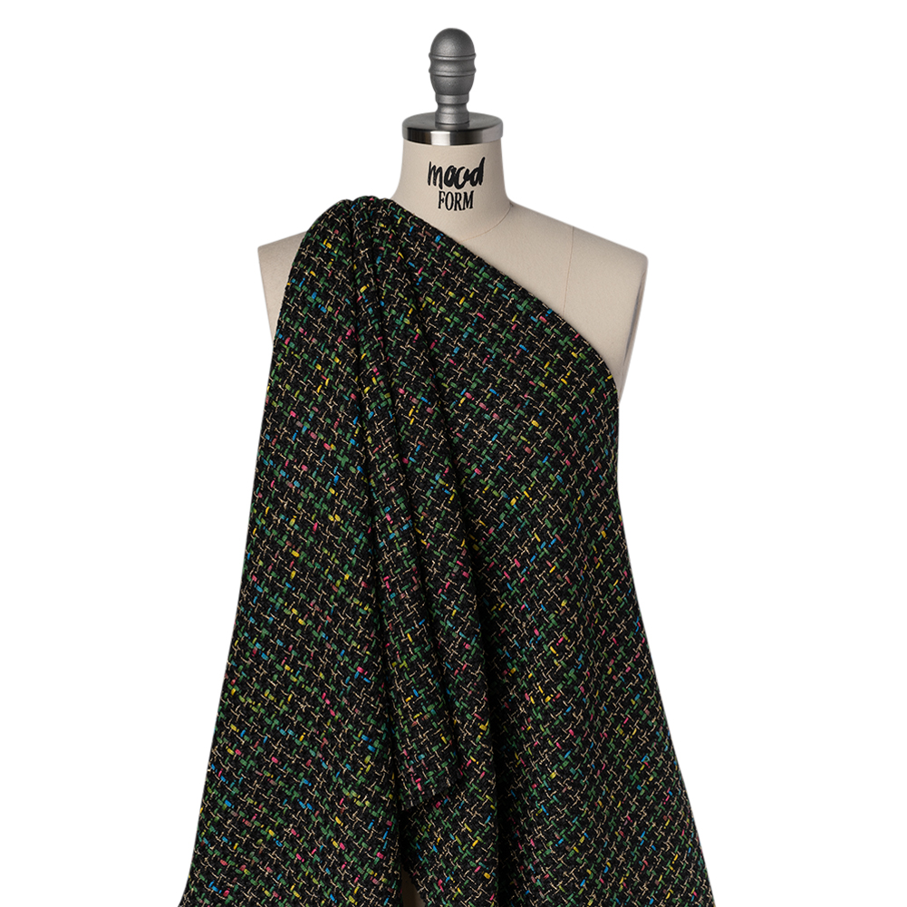 Spring is in full bloom atop this Black, Green and Gold Metallic Acrylic and Wool Tweed—featuring a tactile hand and supple drape.Suggested Projects: Jackets, Blazers, Skirts, DressesContent: Acrylic, Wool, LurexStretch: NoneOpacity: Slightly TranslucentTweed has long held the spotlight on runways and red carpets, its richly dimensional surface and nubby texture making it a statement fabric across eras, genders, and styles. Here, black, green, gold, and ombre rainbow threads interlace into a striking grid-like pattern, full of depth and character. With a supple drape and tactile hand, it’s perfectly suited for Chanel-inspired jackets, tailored blazers with coordinating skirts, or elegant belted coats. Slightly translucent, it benefits from a lining to enhance opacity, comfort, and warmth.