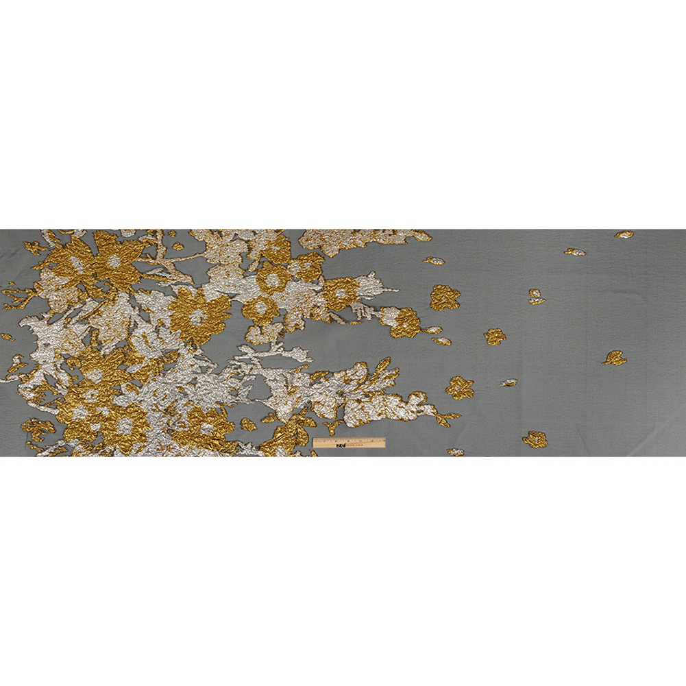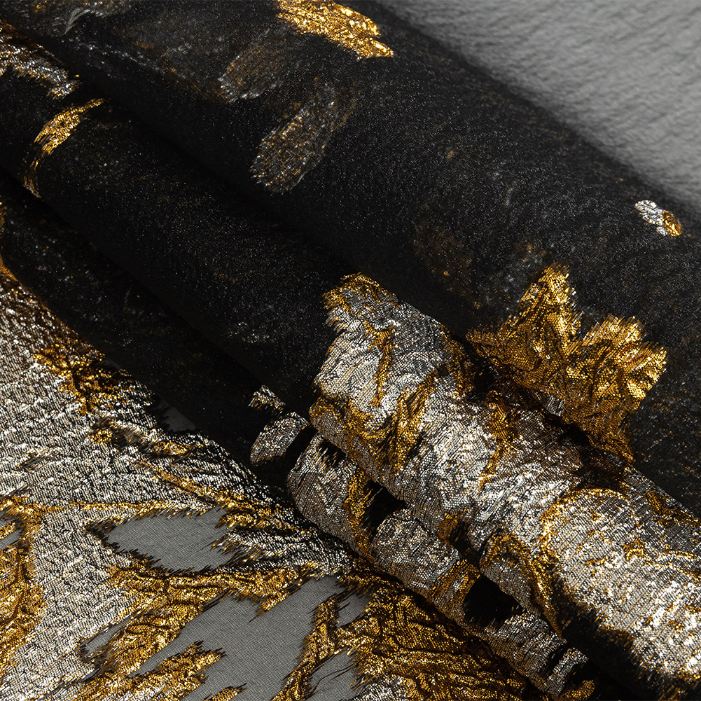 This Metallic Antique Gold, Silver and Black Abstract Luxury Burnout Brocade is sure to set the world on fire! Swaths of metallic orange-gold and bright silver trail like flames across a black organza base. With a crisp hand and light but voluminous drape, fashion wide-skirted evening gowns with sheer sleeves. Use this fabric's translucency to play with overlays and colored linings, or stick with black to keep the bright pattern in the forefront. This pattern begins approximately two inches from the selvages and is denser towards one edge than the other.