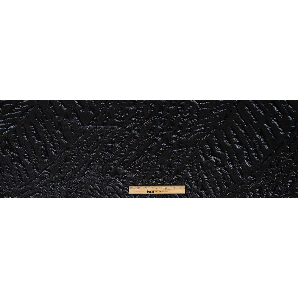 Wickedly shimmering, this Metallic Black Abstract Luxury Brocade calls to mind gothic fairy tales and fantastic nightmares. Black on black ripples over the surface, running every which way like the push and pull of tides on a long forgotten shore. Slick three-dimensional patterning from the Jacquard weave rise above the ground, while the metallic threads give the hand a rough edge. With a flexible drape, construct elegant ball gowns, jackets, and full, flouncy skirts, and consider adding extra wearing ease to accommodate its lack of stretch. Semi-transparent, add lining for opacity and comfort, or more structure if desired.