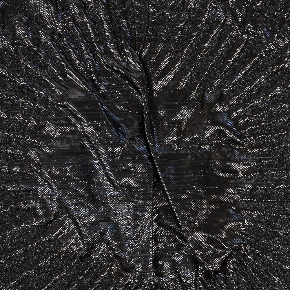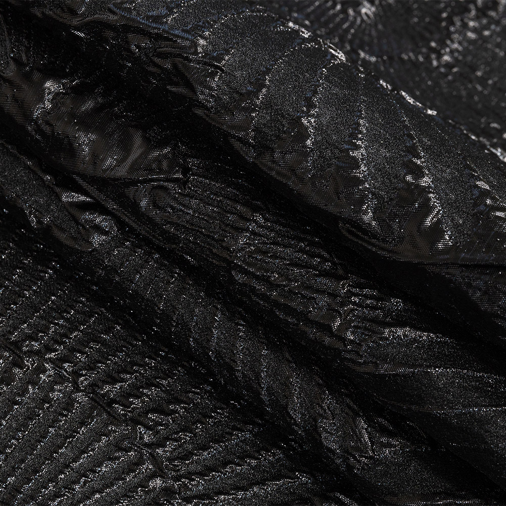 Darkness falls on a spring night, and the garden comes to life on this Metallic Black Abstract Luxury Brocade. Raised petal-like rays of shimmering black burst through pools of the same, while on the reverse, soft petals cut through raised metallic puffs. A stunning pattern sparkles on either side of this reversible material. Crisp and highly textured with a rough edge resulting from the metallic fibers, find a place for this fabric in fabulous evening wear with simple styles that show off the bold pattern. With a semi-flexible drape, craft opulent ball gowns with full circle skirts and structured bodices. Translucent, consider adding a lining for opacity, comfort and additional structure, or to protect delicate threads from unraveling at the seams.