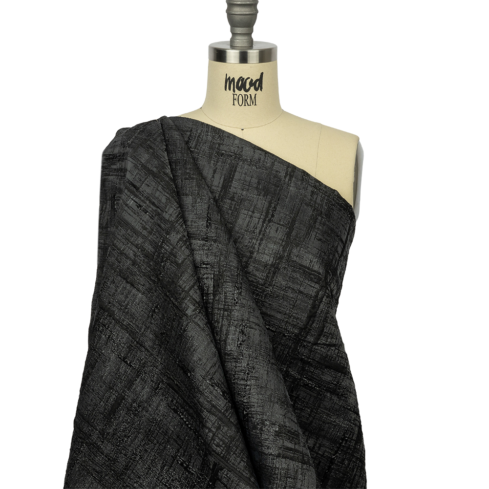 Mysterious and dark as night, this couture-inspired Metallic Black and Charcoal Crosshatching Luxury Brocade is perfect to pair with those black dress shoes! Crisp in hand, a crosshatched pattern spreads over the surface with a delightful, faintly bubbly texture.