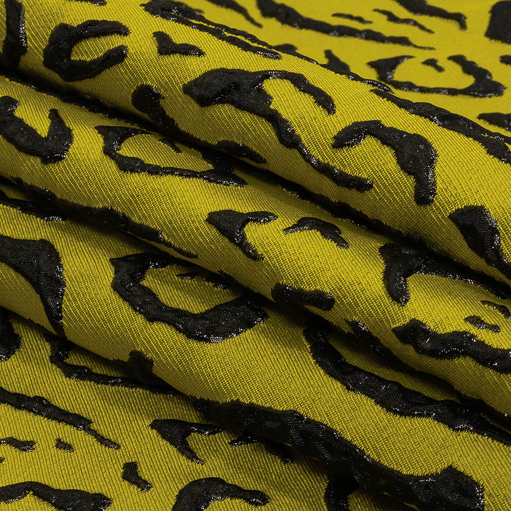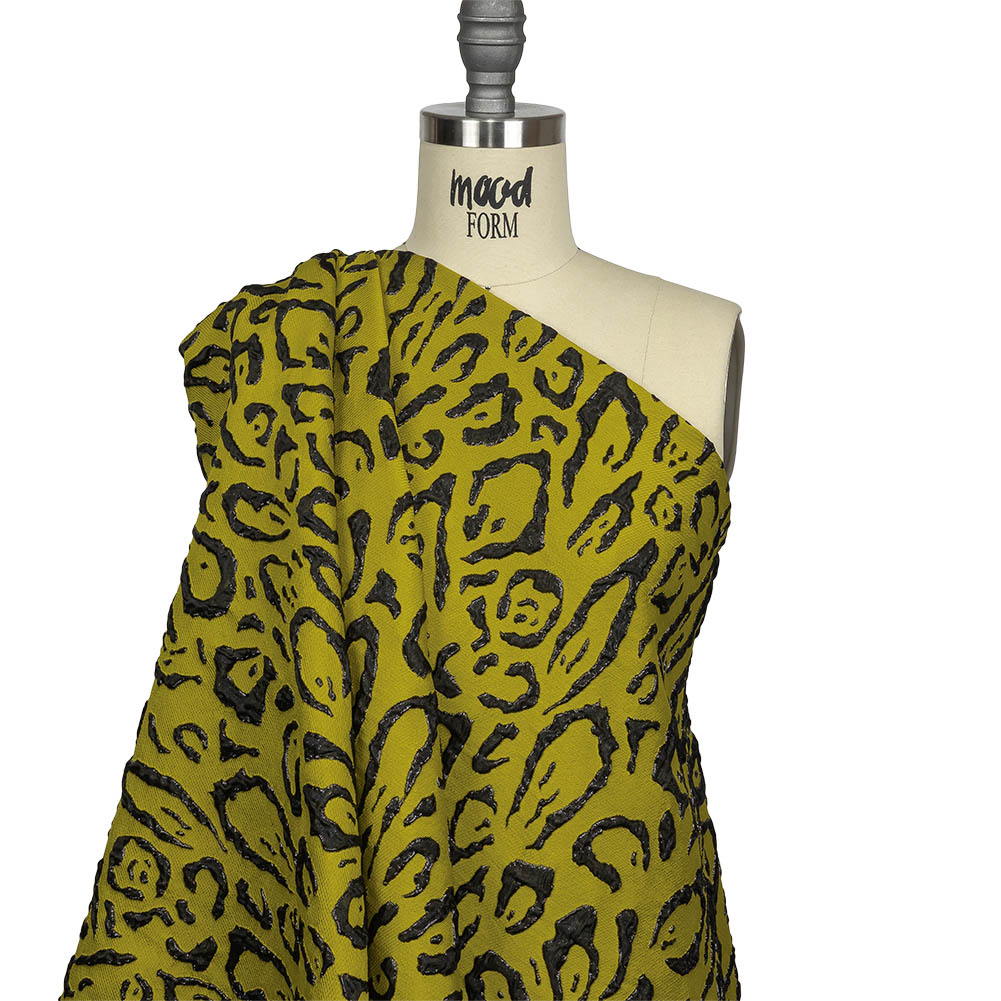 Grab a couple yards of our Metallic Black and Mustard Animal Spots Luxury Brocade, and you'll be ready to rock any edgy, yet glamorous look! Slick-looking animal spots are raised against a mustard yellow ground, gleaming when caught in the light. Coarse and textured in hand with a heavy, structural drape, avant-garde gowns will look just as glamorous as statement moto jackets and lingerie. Completely opaque, we still suggest a lining for maximum comfort.Care and Washing Instructions: Machine wash in temperatures less than 30°C (86°F) or dry clean. Do not iron. Do not bleach. Do not tumble dry.