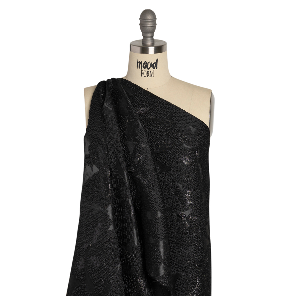 Moonlight reflects off the dew drops in the garden of this Metallic Black Floating Blossoms Luxury Brocade. Black flowers look embroidered onto the lustrous background, their puckered petals and inflated metallic centers adding dimension to the surface. The complex weave of a brocade exudes luxury—an intricately detailed face is the result of additional weft threads during construction. Create voluminous gowns and circle skirts with the malleable drape or fashion structured jackets, bodices, and more. While this fabric is mostly opaque, a silk habotai lining is recommended to increase comfort and luxury!
