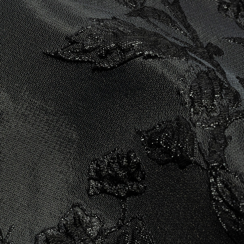 Luscious black ink outlines the intricate flowers and growing branches on this noir-themed Metallic Black Flowering Vines Luxury Brocade. A luminous black background hosts a garden's worth of vine-like branches with blossoms and buds, all decorated with metallic accents. The combination of brocade weave structure and metallic threads creates a crisp hand and bubbly texture. With a flexible, voluminous drape, design corset-top dresses, evening wraps, ballgowns, or gathered skirts! Opaque, a lining is not necessary but may be added for comfort in wear if desired.