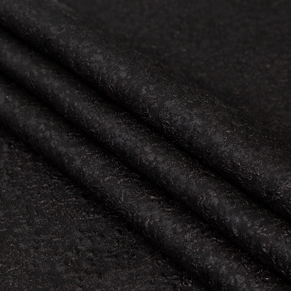Add some flower power to your eveningwear wardrobe with this Metallic Black Luxury Floral Brocade! A black background holds luminous metallic black flowers and dashing accents to create a radiant all-over design. A uniquely tangible hand pairs with a rigid, yet billowing drape to create a truly unique medium for gowns, jackets, circle skirts and more. We suggest creating an ornate, modern take on a Victorian frock coat using this material over one of our many luxurious linings. Lightly translucent in construction, a lining may be used if additional structure or comfort is desired.