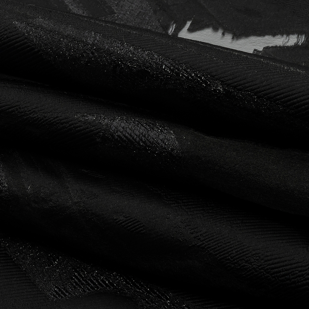 Leave them with an unforgettable impression thanks to this classy Metallic Black Painterly Geometrics Luxury Burnout Brocade! Brushstrokes and hard shapes come together with metallic threads and sheer burnout sections to form an infinitely intriguing material. With a crisp, softly textured hand, it offers a malleable yet structured drape. Enhance your artistic palette by creating a fanciful gown, dress, or skirt! Without stretch and slightly translucent, we recommend adding a lining for full opacity and overall comfort.