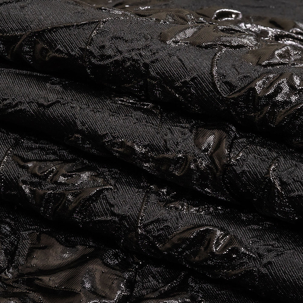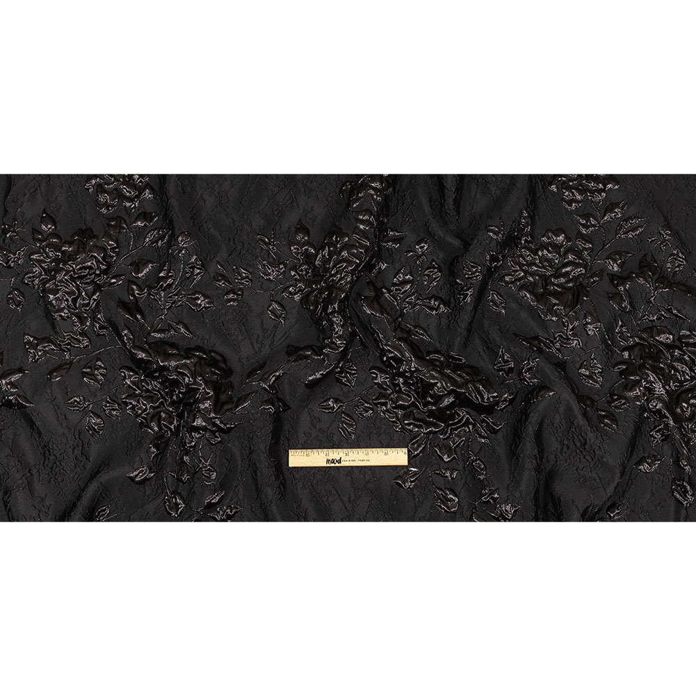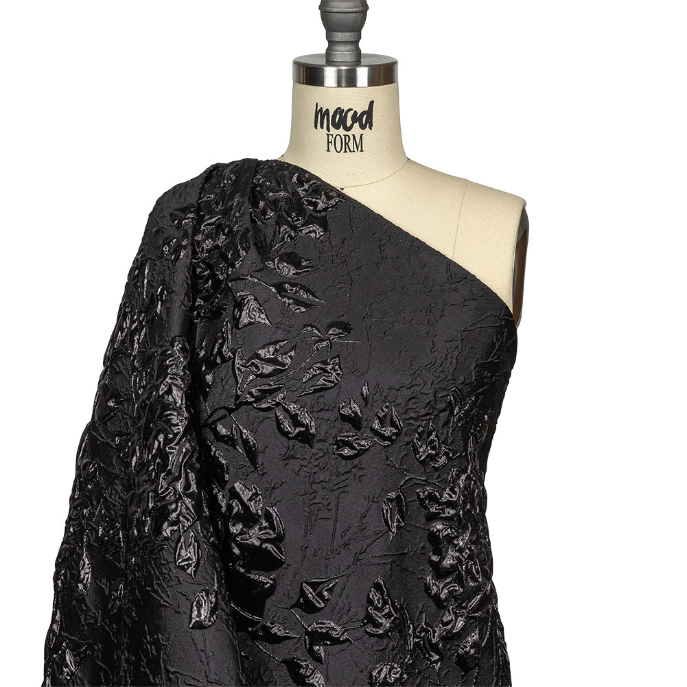 We can't help but love a gothic moment, so bring the drama in this Metallic Black Roses and Leaves Luxury Brocade! A black ground depicts tonal branches sprouting large roses woven in metallic black that dance in the light due to the puckered texture. With a malleable, voluminous drape, this coarse brocade is perfect for stunning sheath dresses and pencil skirts, structured jackets and bodices, or puffy pleated skirts. While opaque, we suggest pairing with a lining for maximum comfort.