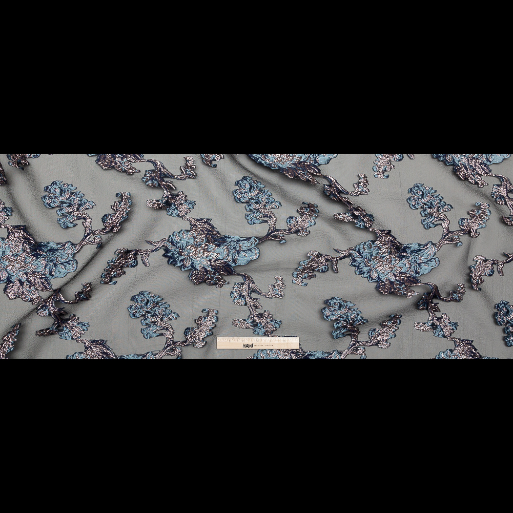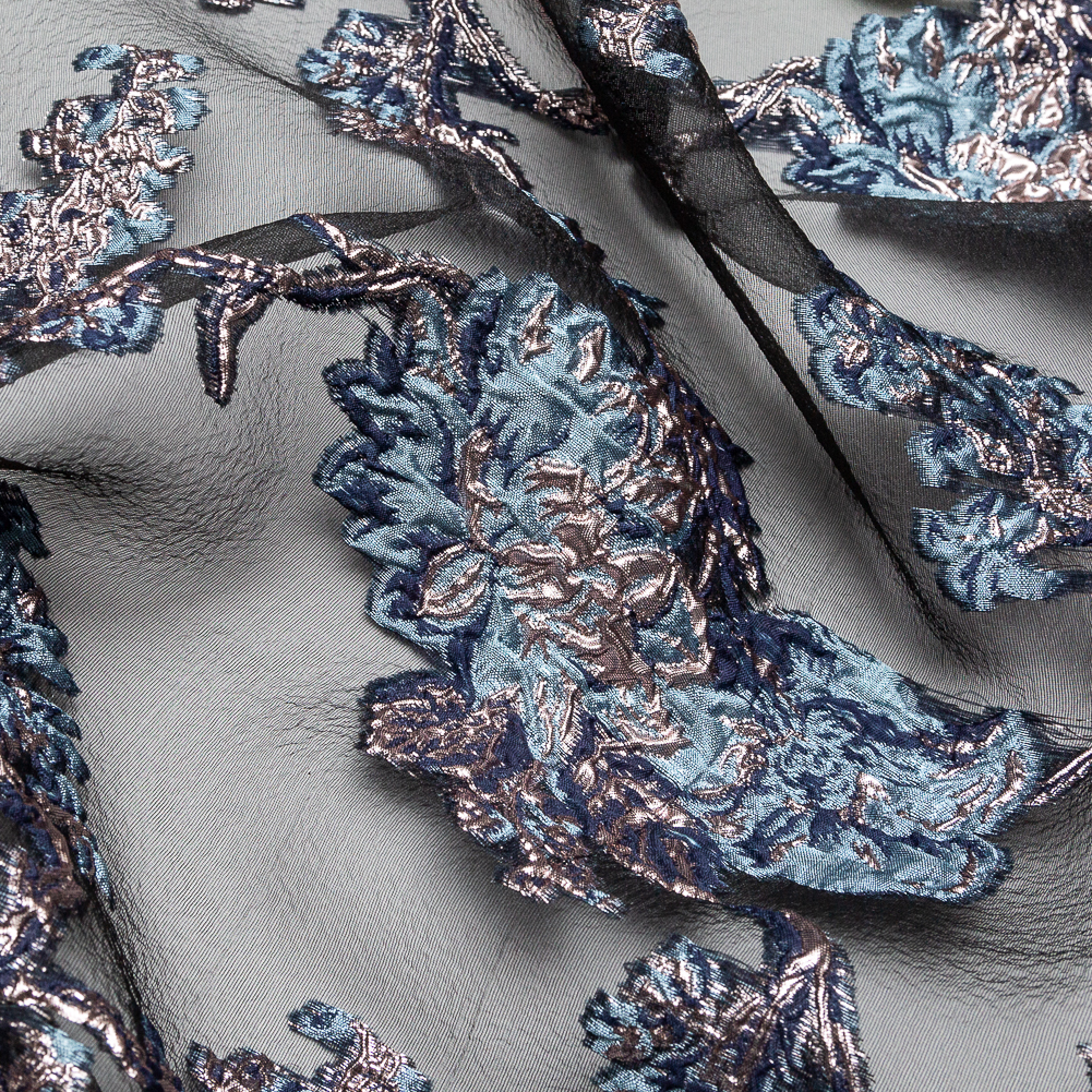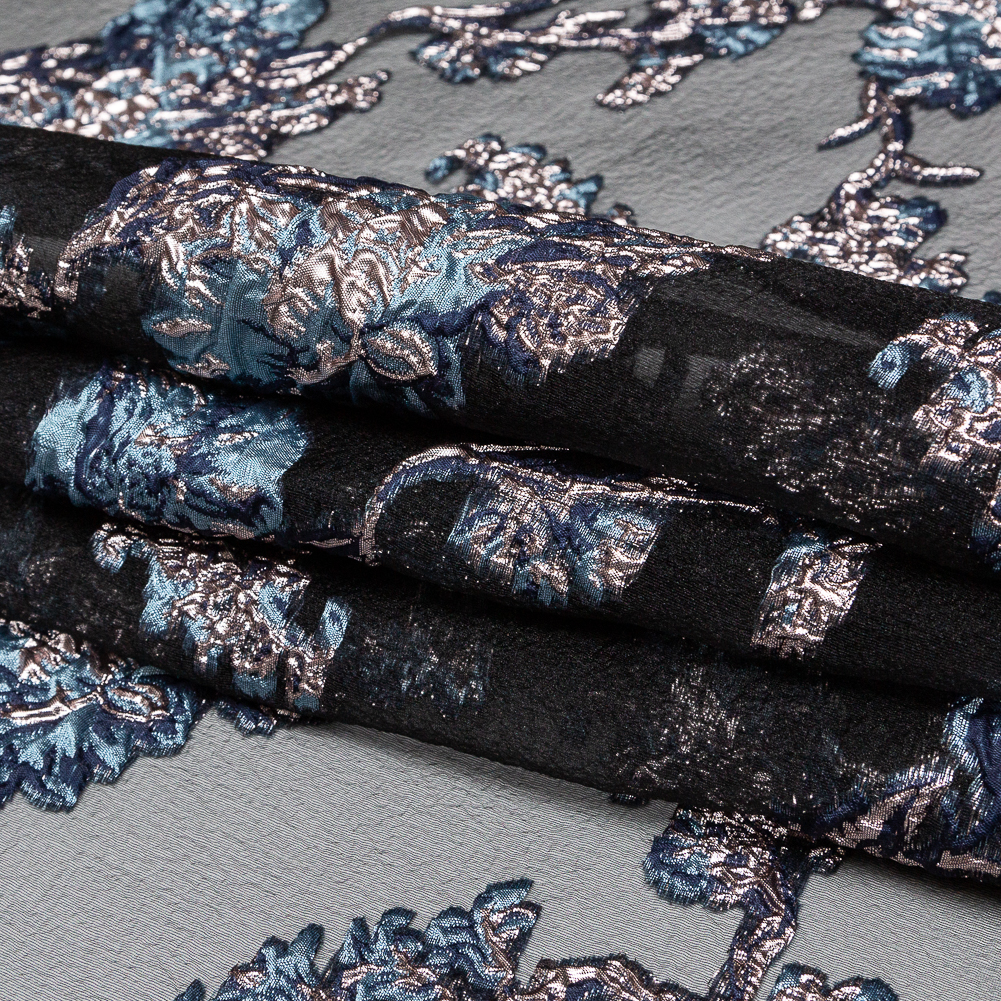 Well within an arm's (or stem's) reach, our Metallic Blue Granite and Rose Gold Luxury Abstract Burnout Brocade is ready for high-fashion when you are! Decadent flowers illuminate a black sheer background, giving this fabric an elegant, chic look fit for the runway. The raised surface of the brocade really allows the ornate design to pop. Thin and lightweight, this fabric comes with a crisp hand and a billowy drape, making it a fantastic choice for drop-dead gorgeous tent dresses, hi-low skirts, and other breezy creations. Semi-sheer, a lining may be added for extra opacity or comfort.