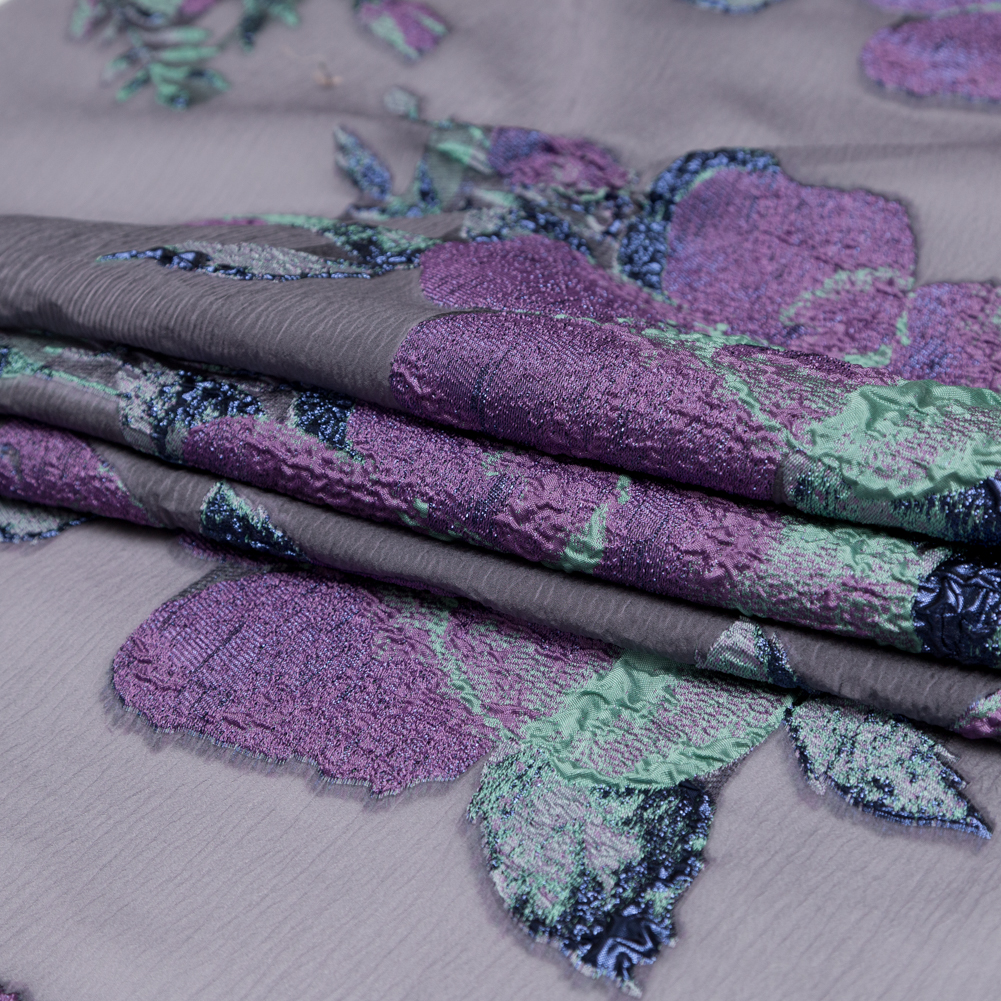 Subdued hues come to life on the mysterious surface of Mood's Metallic Blue Morpho, Periscope, Dark Ivy and Purple Gumdrop Floral Luxury Organza Brocade, mystical bouquets growing ever-bigger in the spotty sunlight. Grand flowers grace the face of this mesmerizing material, like tropical blooms nestled in the rain forest on a misty morning, the metallic yarn shimmering like water droplets pooled in their petals. Bubbling and buttery, its hand is soft overall, though the Lurex® threads are slightly scratchy. Weighted and full, use its graceful drape and lack of stretch to create overlays on high-low skirts, wrap blouses with long bell sleeves, or tailored cocktail dresses with short puff sleeves. Mostly sheer, the flowers do offer a slight opacity. A lining is recommended for an opaque look—if desired—and comfort. Please note, this fabric weighs 154 GSM.