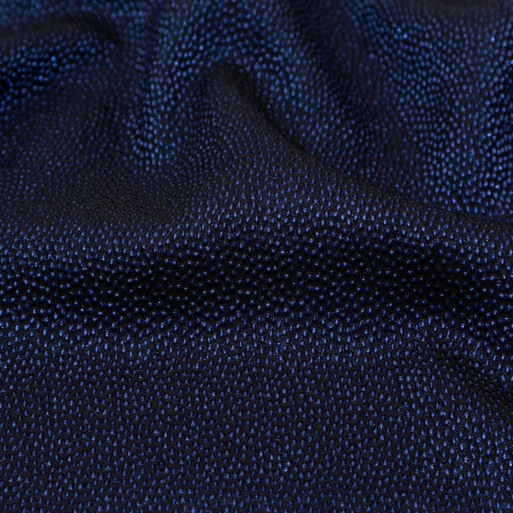 Look like you live in the lap of luxury with this Metallic Blue on Black Abstract Luxury Brocade! A beautiful stippled design covers the whole of this material in a beautiful metallic blue color over a black background. A tangibly tactile hand pairs with a rigidly structured drape, creating a fantastic medium for almost any avant-garde project. Build blazers, corsets, gowns and more from this brocade. We suggest making a glammed out corset using this material and a softer material for the interior, along with any of our varieties of boning for structure. An opaque construction makes a lining unnecessary but may be used if additional comfort is desired or if the piece calls for one.