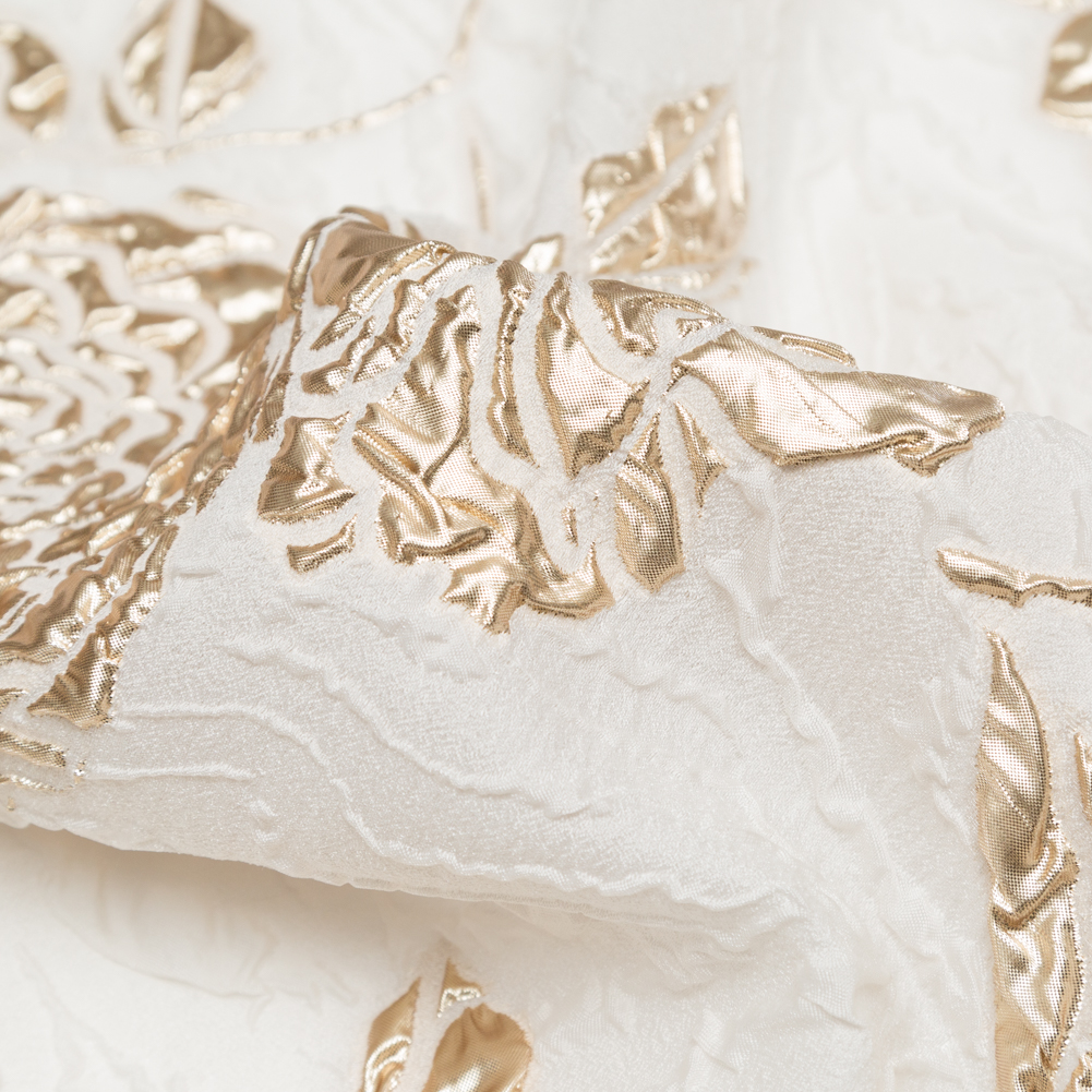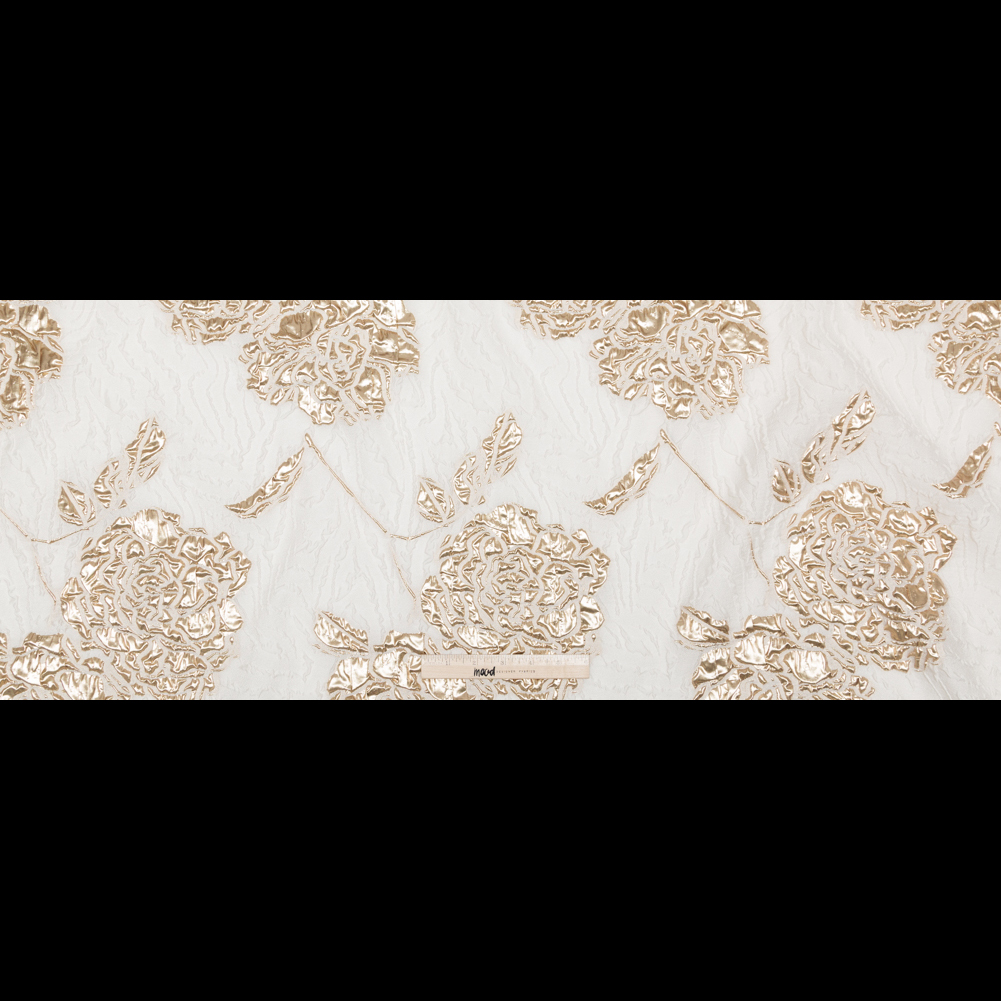 Gilded flowers grace Mood's Metallic Bright Gold and Snow White Rosy Luxury Brocade, molten and marvelous on this marshmallow material. Luminescent roses fall on the face of this blooming brocade like the first snow of the year, shining and serene. Textured and puffy, the metallic threads are slightly scratchy and imbibe the surface with a stunning sheen. When draped, it falls full and fast, a graceful material ideal for tailored dresses with puff sleeves, light spring jackets, and circle skirts. Without stretch, this fabric is mostly translucent, while the flowers feature a slightly raised opacity. A lining is recommended for increased comfort and opacity purposes. Please note, this fabric weighs 103 GSM.