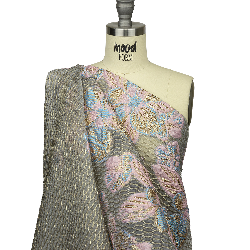 Pink-a-boo! We just found our new fan favorite with this Metallic Bright Gold, Pink-a-boo and Bonnie Blue Florals and Latticework Sheer Luxury Brocade! A golden lattice design features a sparkling gray organza base with pink and blue florets woven towards one selvage edge. With a bouncy, voluminous drape and without stretch, use this fabric as an overlay for glamorous ball gowns with a cottagecore touch, sheer evening jackets, fuller skirts, and more. Transparent, a lining is recommended for modesty when desired.