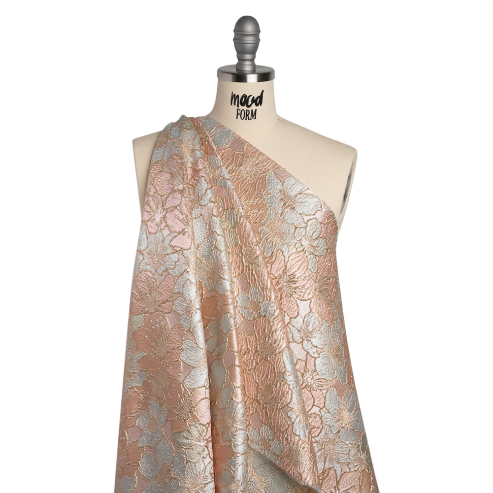 Embody aristocratic luxury in this Baby Pink, Pale Aqua and Gold Floating Blossoms Metallic Brocade. With a tactile hand and semi-structured drape, it’s a truly ornate choice for your next special occasion.Suggested Projects: Corsets, Gowns, Skirts, JacketsContent: 100% PolyesterStretch: NoneOpacity: Slightly TranslucentEmbossed baby pink and pale aqua blossoms—their petals accentuated with metallic gold threads—float atop a baby pink backdrop, creating a three-dimensional, tactile hand and falling in a semi-structured drape. With its floral design, this fabric is perfect for billowing evening gowns, hoop skirts, tie-back corsets, and even tailored jackets. As this fabric is slightly translucent, we recommend using a lining for increased opacity and structure.