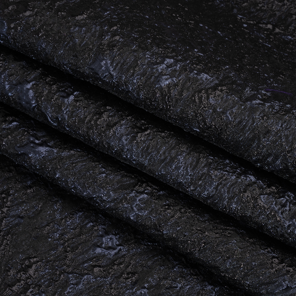 Ravens and mysteries are found atop this Black and Navy Abstract Sponge Texture Metallic Brocade. With a tactile hand and semi-structured drape, clean up your eveningwear with this fabric.Suggested Projects: Gowns, Skirts, JacketsContent: 100% PolyesterStretch: NoneOpacity: TranslucentBlack and navy threads weave an abstract design atop this elegant fabric. With a sponge-like, tactile hand and semi-structured drape, this brocade will make every night out a magical one. We envision shimmering, flowing gowns, billowing hoop skirts, or even suit jackets—each piece ready to make the best-dressed list. As this fabric is translucent, we recommend use with a lining for increased opacity and structure.
