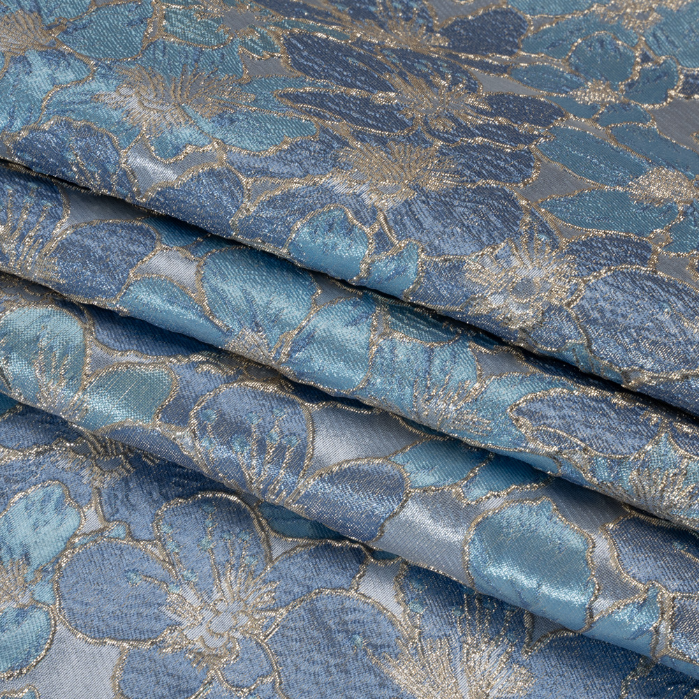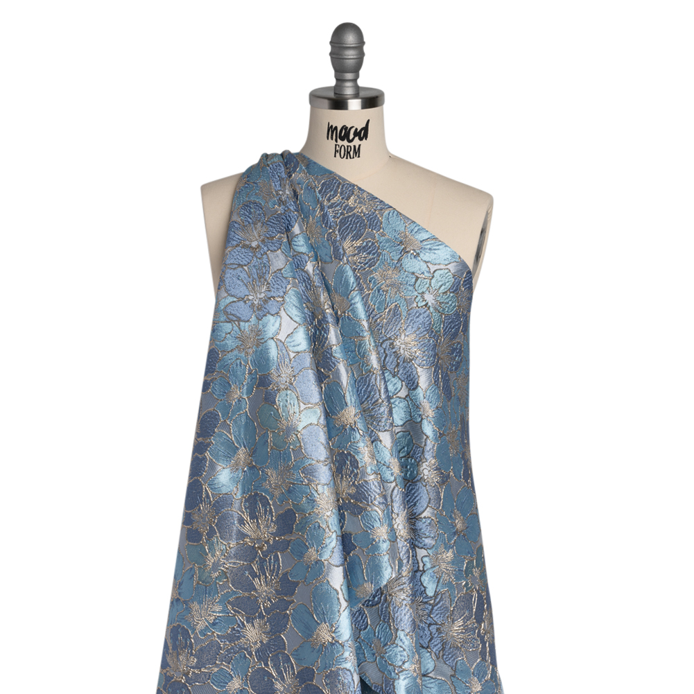 The stars have aligned and introduced this Blue and Gold Floating Blossoms Metallic Brocade into your life. With a tactile hand and semi-structured drape, it’s a truly ornate choice for your next special occasion.Suggested Projects: Corsets, Gowns, Skirts, JacketsContent: 100% PolyesterStretch: NoneOpacity: Slightly TranslucentEmbossed country blue and sky blue blossoms—their petals accentuated with metallic gold threads—float atop a gray-blue backdrop, creating a three-dimensional, tactile hand and falling in a semi-structured drape. With its floral design, this fabric is perfect for billowing evening gowns, hoop skirts, tie-back corsets, and even tailored jackets. As this fabric is slightly translucent, we recommend using a lining for increased opacity and structure.