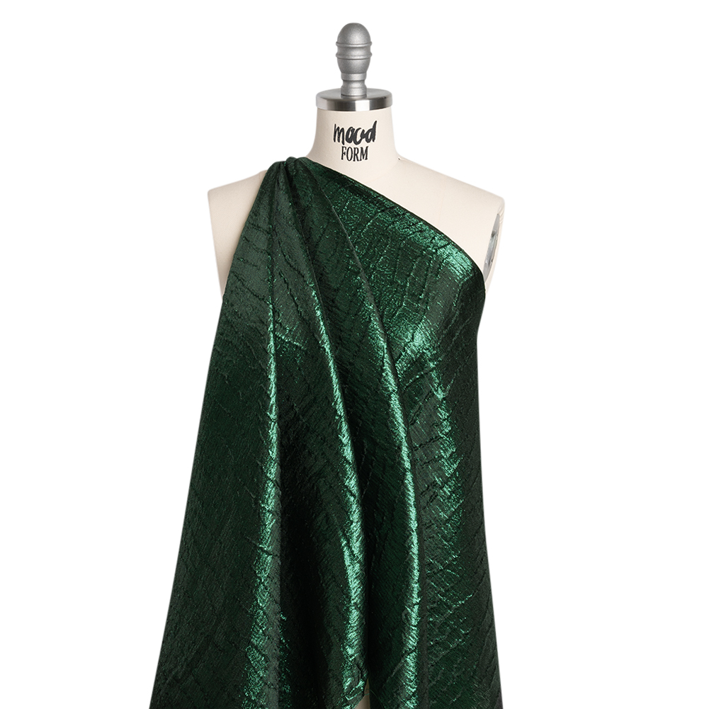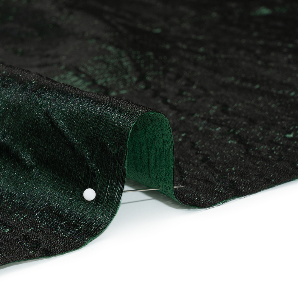 Find forgotten secrets and spells when you delve into this Forest Green Subtle Wrinkles Metallic Brocade, featuring a tactile hand and voluminous drape.Suggested Projects: Gowns, Skirts, Jackets, BlazersContent: 100% PolyesterStretch: NoneOpacity: Slightly TranslucentA sprinkling of pixie dust settles atop this metallic brocade. A sprawling forest green backdrop, softly embossed with subtle wrinkles, unfolds like a magical masterpiece. With a tactile hand and a voluminous drape, this fabric was destined for fairytale creations. We picture gowns that shimmer with storybook grace, flowing skirts that look like they were crafted by your fairy godmother, or even magical suit jackets adorned with avant-garde, poofy sleeves—each piece ready to step into your happily ever after. As this fabric is slightly translucent, we recommend use with a lining, or over camis or slips.