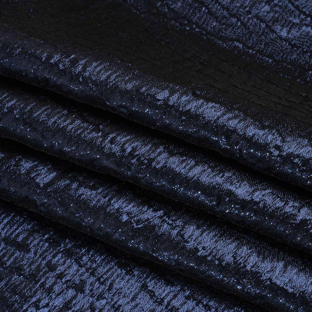 Untold designs hide in the deep waters of this Navy Blue Subtle Wrinkles Metallic Brocade, featuring a tactile hand and voluminous drape.Suggested Projects: Gowns, Skirts, Jackets, BlazersContent: 100% PolyesterStretch: NoneOpacity: Slightly TranslucentA sprinkling of pixie dust settles atop this metallic brocade. A billowing navy blue backdrop, softly embossed with subtle wrinkles, unfolds like a magical masterpiece. With a tactile hand and a voluminous drape, this fabric was destined for fairytale creations. We picture gowns that shimmer with storybook grace, flowing skirts that look like they were crafted by your fairy godmother, or even magical suit jackets adorned with avant-garde, poofy sleeves—each piece ready to step into your happily ever after. As this fabric is slightly translucent, we recommend use with a lining, or over camis or slips.
