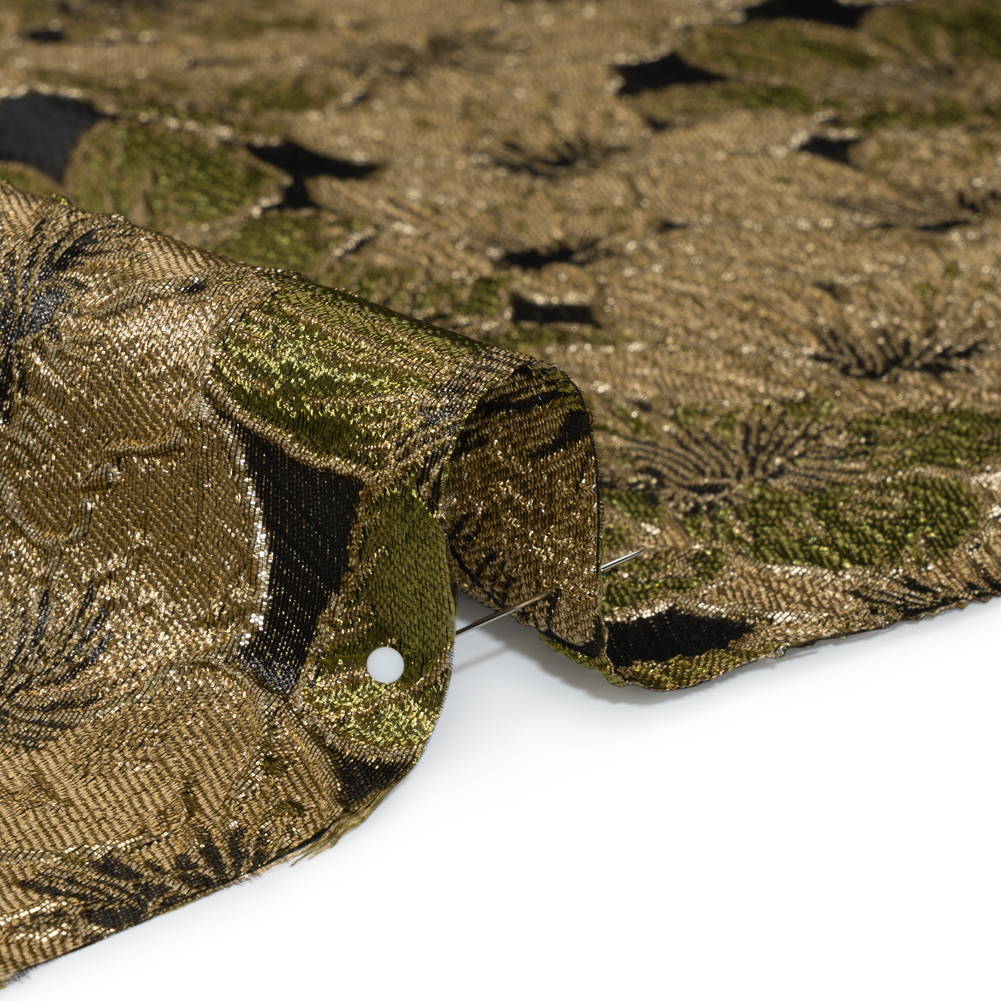 Indulge in Art Nouveau fashions alongside Dorian Gray with this Olive Green, Beige and Gold Floating Blossoms Metallic Brocade. With a tactile hand and semi-structured drape, it’s a truly ornate choice for your next special occasion.Suggested Projects: Corsets, Gowns, Skirts, JacketsContent: 100% PolyesterStretch: NoneOpacity: Slightly TranslucentEmbossed olive green and beige blossoms—their petals accentuated with metallic gold threads—float atop a dark brown backdrop, creating a three-dimensional, tactile hand and falling in a semi-structured drape. With its floral design, this fabric is perfect for billowing evening gowns, hoop skirts, tie-back corsets, and even tailored jackets. As this fabric is slightly translucent, we recommend using a lining for increased opacity and structure.