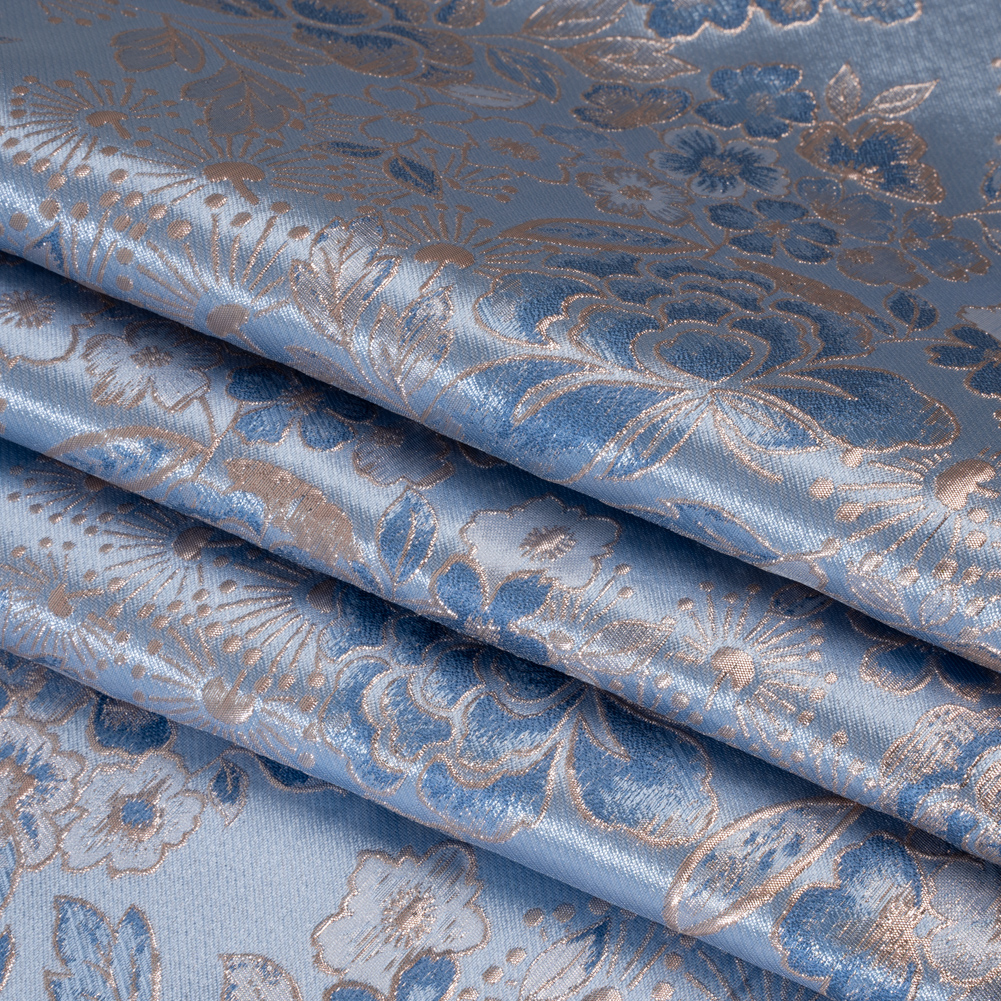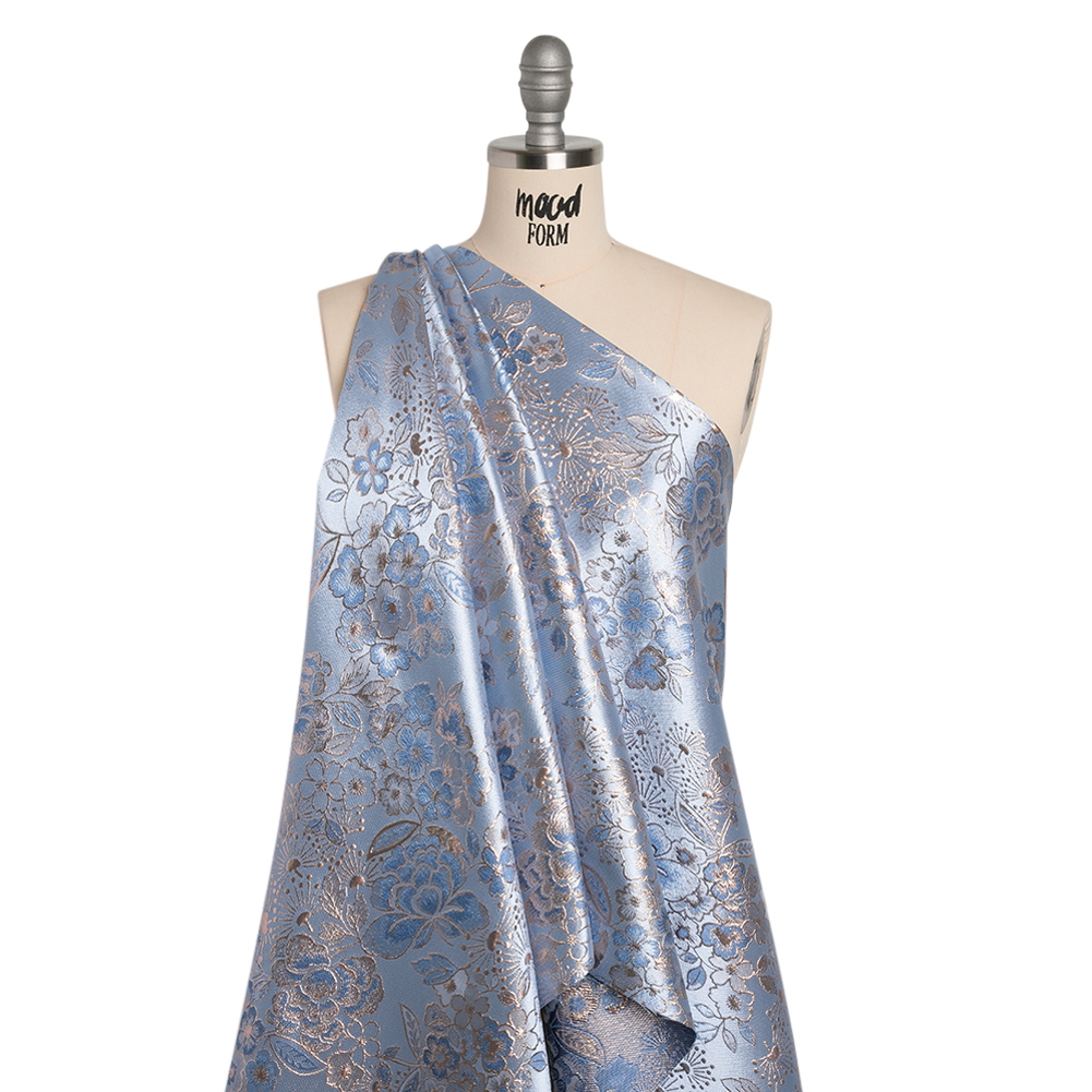 The only blues you’ll have in your life is this Pastel Blue, Country Blue and Silver Flower Garden Metallic Brocade. With a tactile hand and semi-structured drape, it fits right in with the whimsy of Wonderland.Suggested Projects: Gowns, Skirts, JacketsContent: 100% PolyesterStretch: NoneOpacity: Mostly OpaqueA secret garden is in full bloom atop this metallic brocade. Embossed country blue and silver floral and leaf outlines climb across a pastel blue backdrop, creating a three-dimensional, tactile hand and falling in a semi-structured drape. This fabric is perfect for a glistening evening gown or stunning high-low skirt, or for an Alice in Wonderland inspired avant-garde look. Though this fabric is opaque, we suggest including a lining for complete opacity and increased structure.