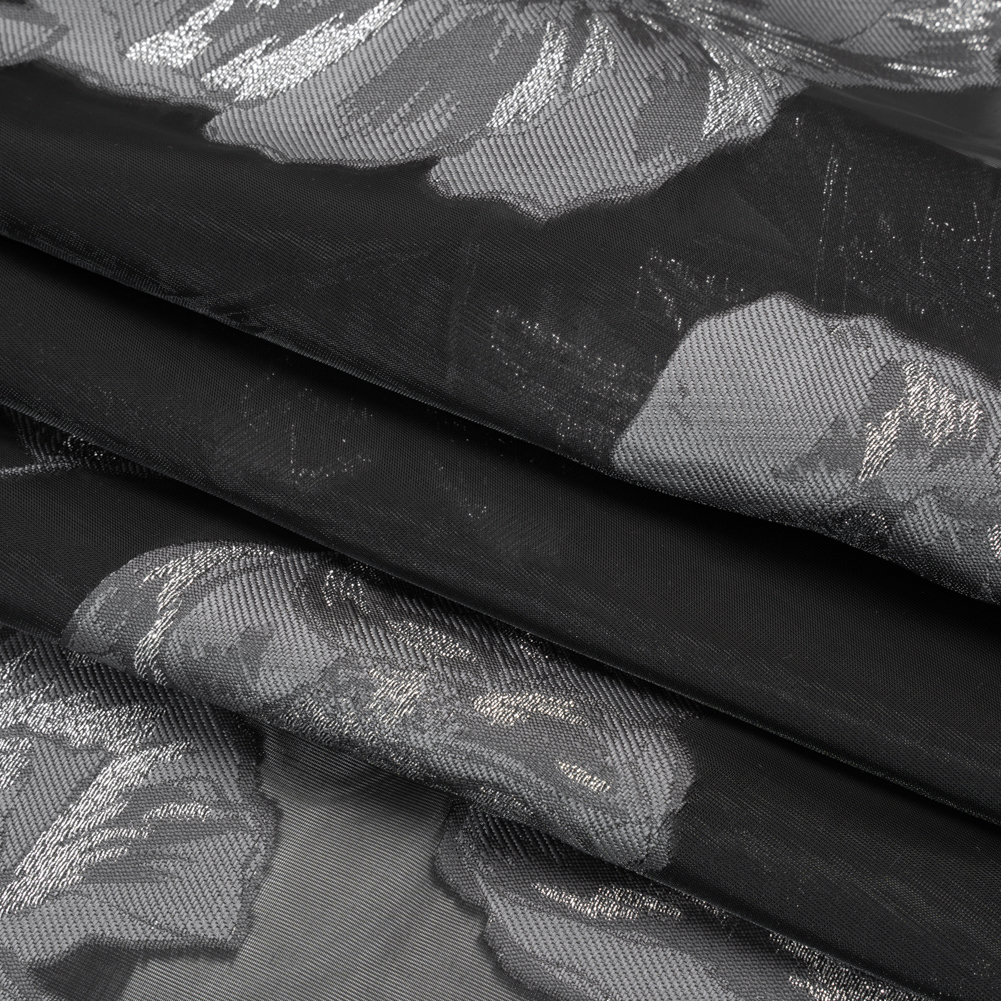 Monochrome magnificence unfurls from this Floral Metallic Burnout Brocade—featuring a smooth, lightly tactile hand and airy drape.Suggested Projects: Overlays for Gowns, Skirts, JacketsContent: 62% Polyester, 15% Nylon, 23% LurexStretch: NoneOpacity: SheerBig gray flowers and leaves bloom boldly atop this ethereal burnout brocade, their forms emphasized by glimmering metallic silver accents. The interplay between the gleaming threads and sheer base creates an eye-catching contrast that highlights the delicacy and depth of the design. With a smooth yet slightly tactile hand—courtesy of the intricate silver and gray weaving—and a soft, airy drape, this fabric is ideal as a statement overlay for gowns, flowing skirts, or even structured suit jackets. Mostly sheer, we recommend pairing with a luxurious lining to enhance opacity and maintain elegance.