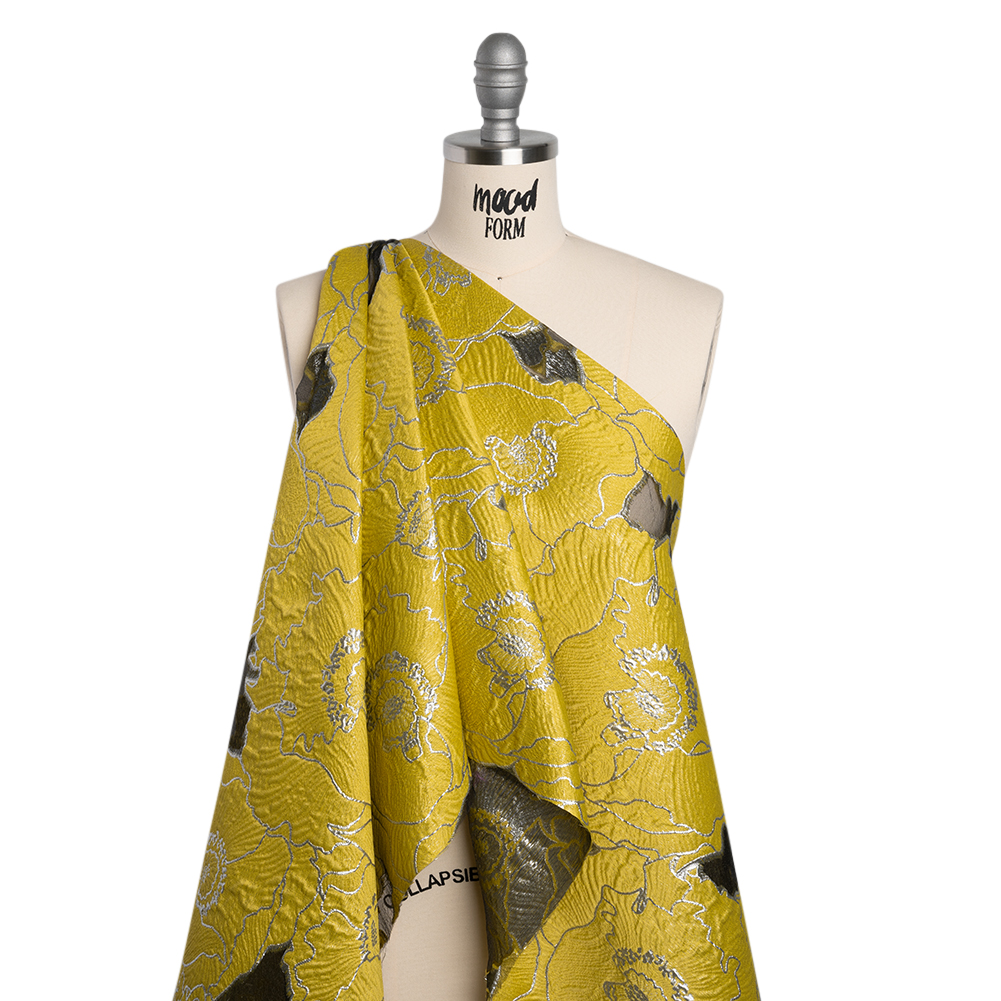 Sunshine coaxes this Gamboge Yellow and Silver All-Over Outlined Flowers Metallic Burnout Brocade to rise to its fullest potential. With a sleek, tactile hand and slightly structured drape, feel like a delicate fairy nestled in the blooming bundle of this fabric.Suggested Projects: Gowns, Skirts, Jackets, OverlaysContent: 100% PolyesterStretch: NoneOpacity: SheerOversized gamboge yellow flowers bloom across a sheer black burnout background, their metallic silver outline grabbing the eye and naturally emphasizing the bouquets. With a sleek yet tactile hand and slightly structured drape, this burnout brocade is perfect as an elegant overlay for a gown, skirt, and even suit jackets—or get creative with its minimal burnout nature and craft stunning peekaboo garments! The fabric is of a sheer nature, so we suggest adding an equally luxurious lining if you’re looking to preserve modesty, or layering it over camis or slips.