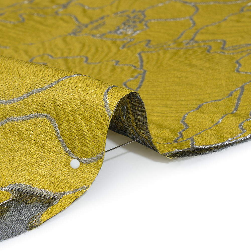 Sunshine coaxes this Gamboge Yellow and Silver All-Over Outlined Flowers Metallic Burnout Brocade to rise to its fullest potential.