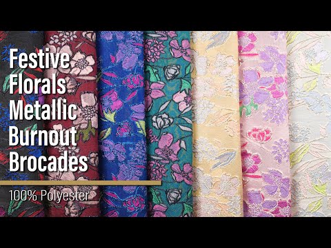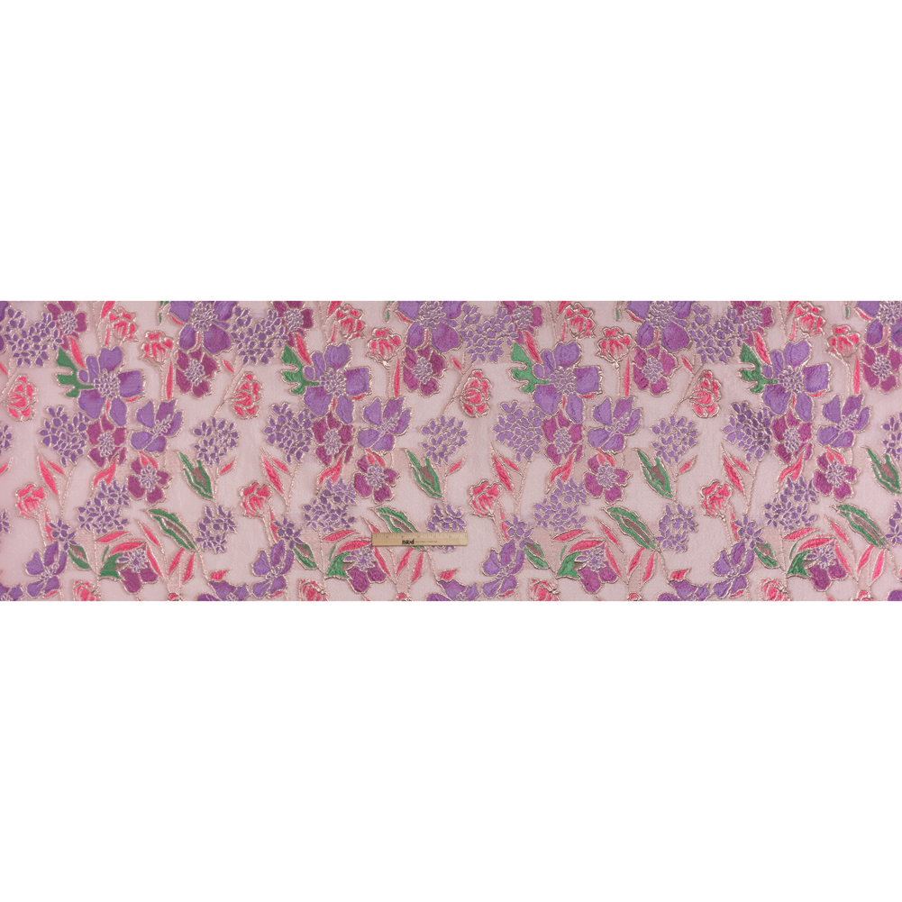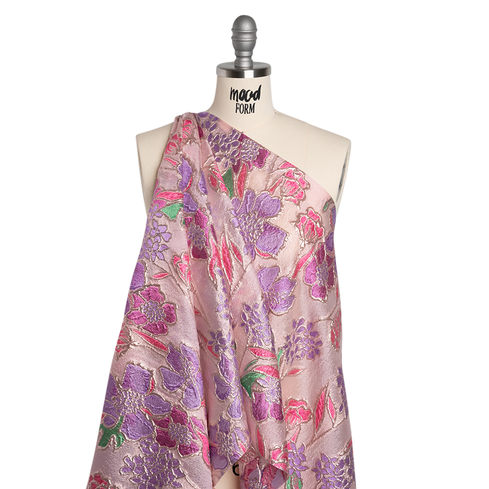 Sew your own happily ever after with this Purple, Pink and Rose Gold Festive Florals Metallic Burnout Brocade—featuring a tactile hand and airy drape.Suggested Projects: Overlays for Gowns, Skirts, JacketsContent: 100% PolyesterStretch: NoneOpacity: SheerHoliday cheer blooms across this sheer pale pink burnout brocade in purple, hot pink, and vivid green festive florals, their petals and leaves outlined starkly in metallic rose gold. The metallic rose gold outlines and lustrous florals grab the eye and naturally emphasize and contrast the sheer nature of the burnout. With a tactile hand and airy drape, this burnout brocade is perfect as an elegant overlay for a gown, skirt, and even suit jackets! Most of the brocade is sheer, so we suggest adding an equally luxurious lining if you’re looking to preserve modesty.