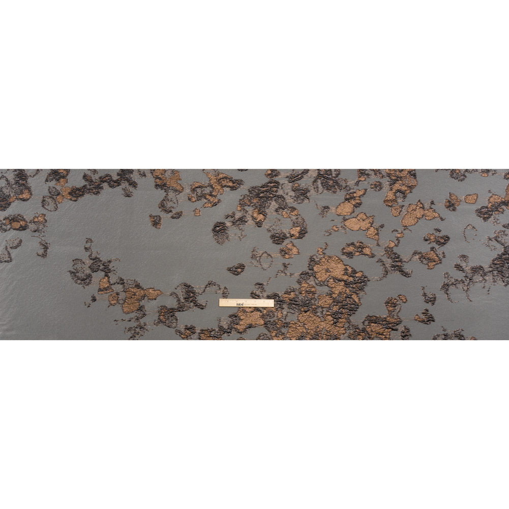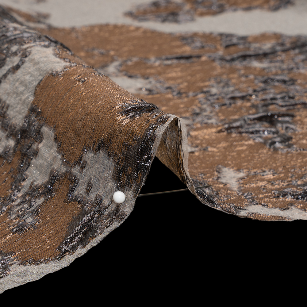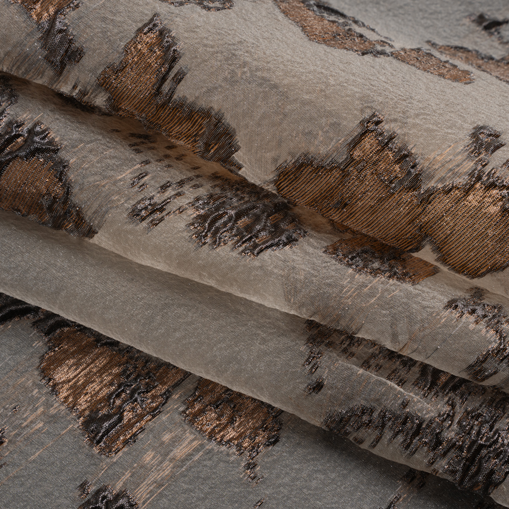 Lay this Brown and Black Abstract Metallic Burnout Luxury Brocade over your next project, featuring a tactile hand and semi-structured drape.Suggested Projects: Overlays for Gowns, Skirts, JacketsContent: 46% Polyester, 54% LurexStretch: NoneOpacity: SheerMetallic brown and black ridges smatter across a sheer, light brown background. The hand is tactile and dimensional, thanks to the brocade weave, and the drape is semi-structured. This luxury brocade is perfect as an elegant overlay for a gown, skirt, and even suit jacket! Sheer, a lining may be desired depending on the application.
