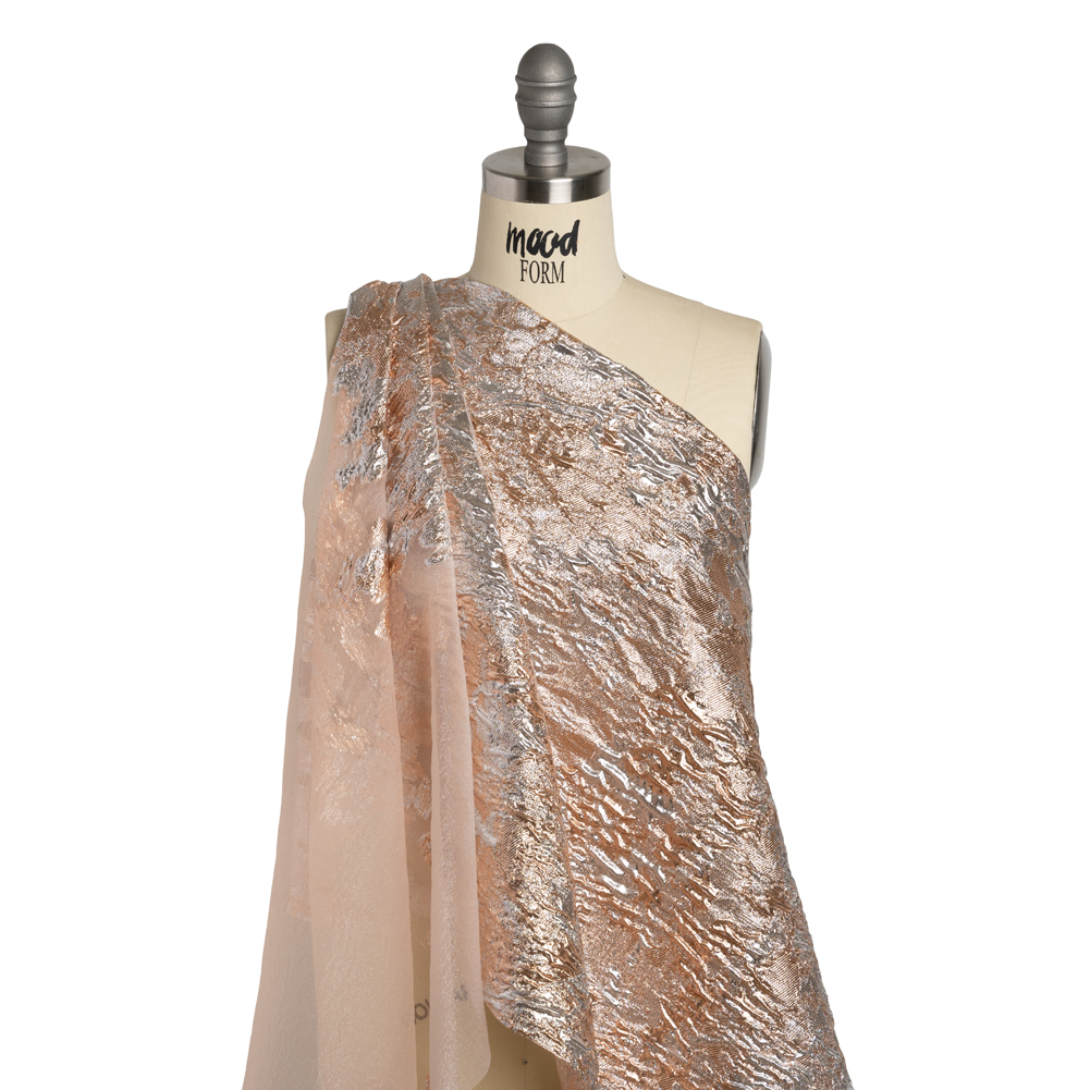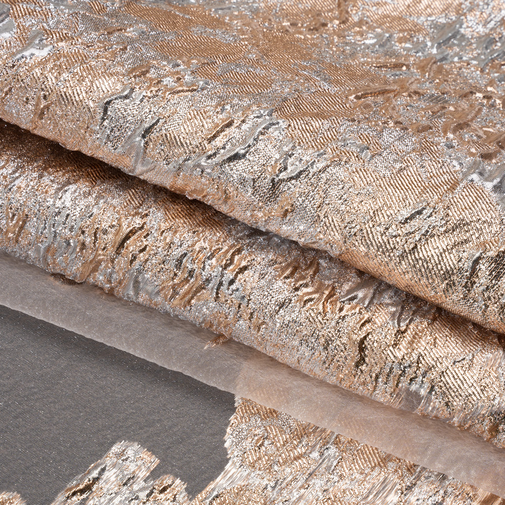 There’s nothing abstract about the luxury of this Abstract Crinkled Borders Metallic Burnout Luxury Brocade, featuring a tactile hand and semi-structured drape.Suggested Projects: Gowns, Skirts, Jackets, OverlaysContent: 46% Polyester, 54% LurexStretch: NoneOpacity: SheerMetallic peach and silver washes across this brocade, creating an abstract, crinkled border around a sheer, black burnout background. The hand is tactile and dimensional, thanks to the brocade weave, and the drape is semi-structured. Use this luxury brocade to create voluminous ballgowns, structured jackets, overlays for skirts, and more! A lining may be desired for full opacity.