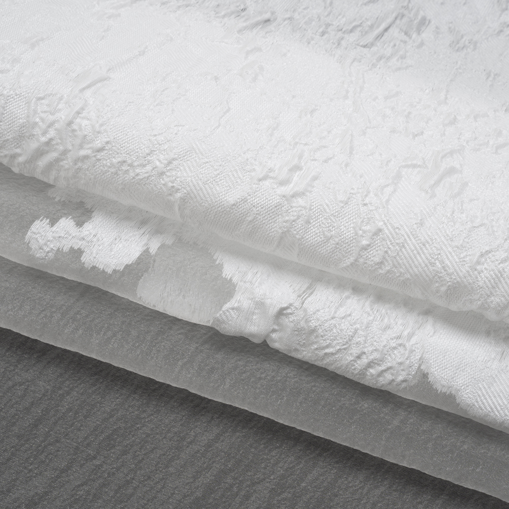 There’s nothing abstract about the luxury of this Abstract Crinkled Borders Metallic Burnout Luxury Brocade, featuring a tactile hand and semi-structured drape.Suggested Projects: Gowns, Skirts, Jackets, OverlaysContent: 46% Polyester, 54% LurexStretch: NoneOpacity: SheerA slightly-iridescent white washes across this brocade, creating an abstract, crinkled border around a sheer, white burnout background. The hand is tactile and dimensional, thanks to the brocade weave, and the drape is semi-structured. Use this luxury brocade to create voluminous ballgowns, structured jackets, overlays for skirts, and more! A lining may be desired for full opacity.