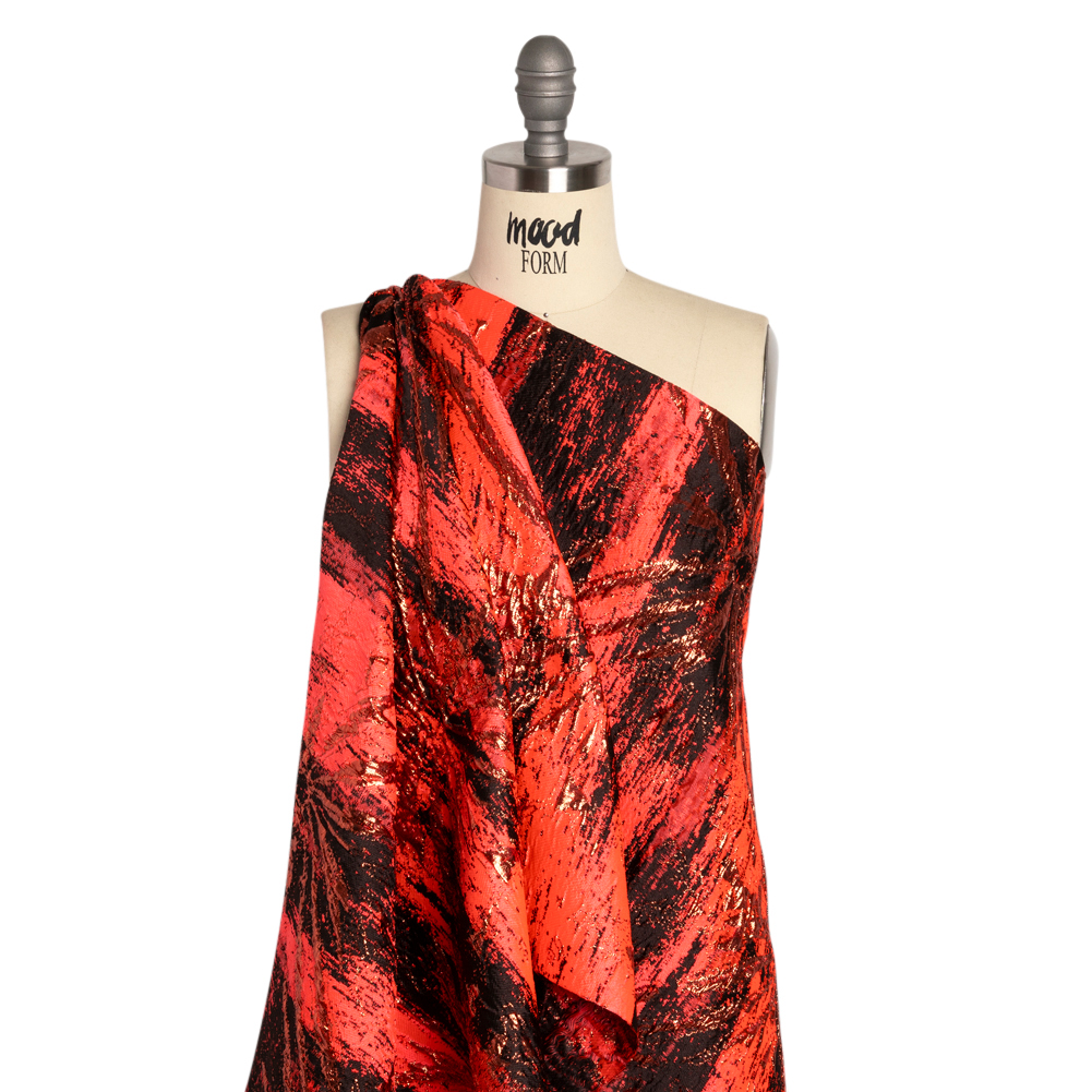 Own the night with this Metallic Copper, Neon Coral and Black Exploding Flowers and Brushstrokes Luxury Brocade! As night falls like paintbrush strokes over a hot pink sky, bronze flowers burst like fireworks. Their metallic shine isn’t the only thing that makes these flowers pop—the complex weave raises these flowers, along with ripples in the face, to give them an embossed look and add texture to the slick hand. Evoking a sense of luxury due to its dimensional face, subtle luster, and voluminous drape, this fabric is stunning in elegant garments and special-occasion formal wear. Punctuate your evening with bold gowns, unique circle skirts, exciting corsets, structured jackets, and more. Plus, you can increase comfort and luxury with the addition of a silk habotai lining!