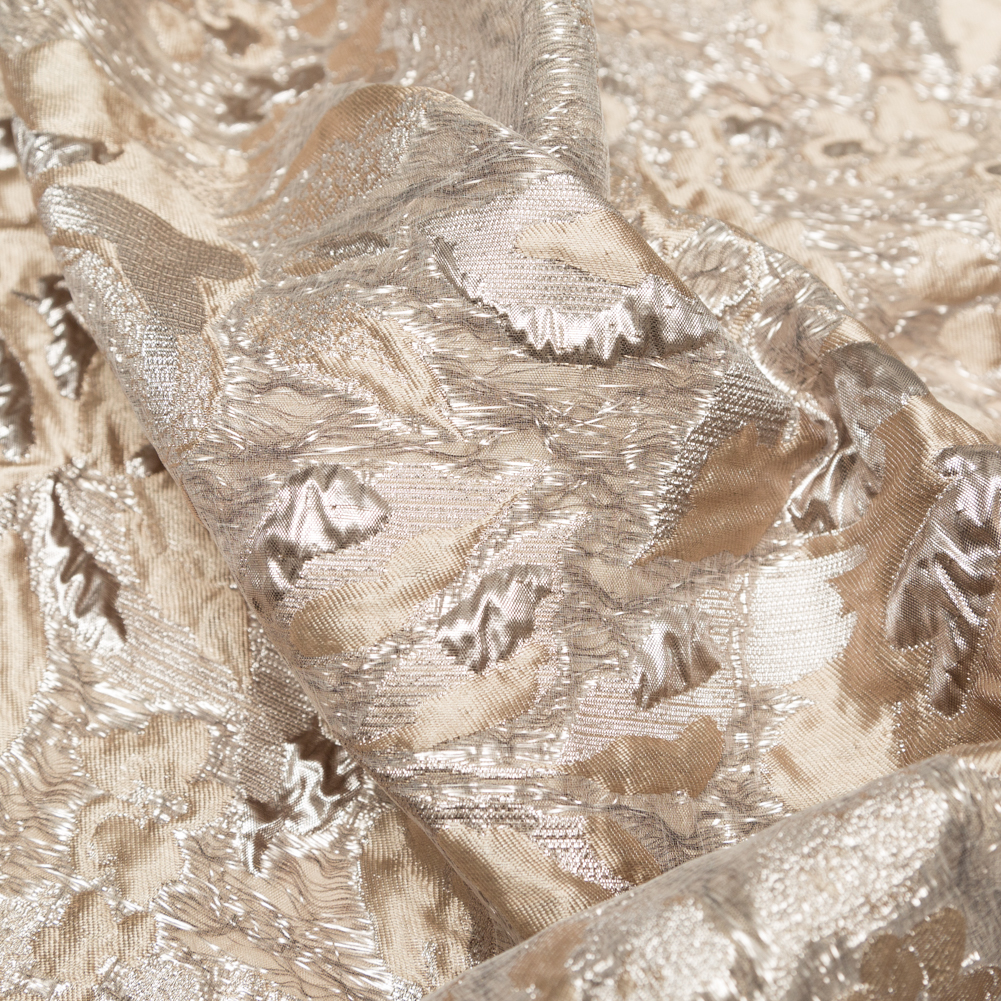 Bold shades of beige coalesce to create Mood's Metallic Crockery and Twill Rosy Luxury Brocade, a basic hue turned beautiful. Textured all around with some soft spaces, this lovely textile features a lustrous shine as flowers flutter across the face. Its full and airy drape make it ideal for cocktail dresses with tailored busts, boat-neck blouses with bell sleeves, or light evening jackets cinched at the waist. Without stretch, it is sheer all around, though some spots do feature a slightly raised opacity. A lining is recommended for increased opacity and comfort. Please note, this fabric weighs 82 GSM.