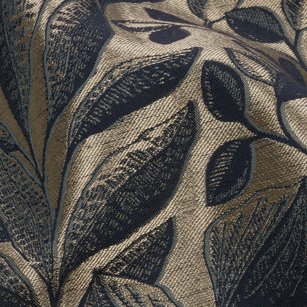 Fallen foliage floats freely through the quiet current of this British Imported River Lucent Leaves Metallic Drapery Jacquard. Wearing the light like an accessory, a tamed display of metallic leaves pops against a blue-colored background. The complex, dimensional weave of a Jacquard promises an elegant feel; paired with a supple drape and lustrous face, this specific Jacquard elevates the look of any room. Draw your eyes up to your ceilings with long, pooling drapes, invite shine into your formal dining and living rooms, or pair them with sheers for an airy, heavenly look. Mostly opaque, a lining may be necessary for added sun protection.