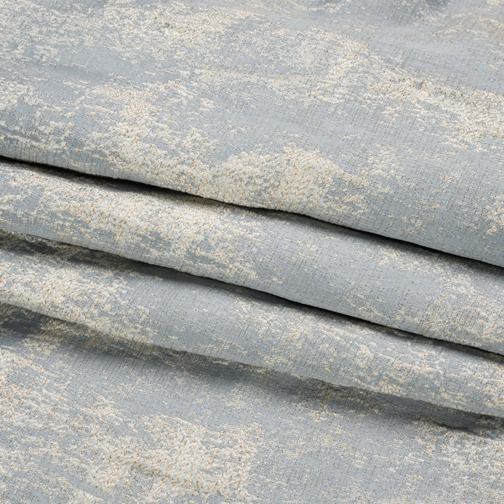 Luxurious intrigue separates this British Imported Wedgewood Abstract Metallic Drapery Jacquard from the rest. Like a white-capped ocean, pale gray and metallic gold threading ripples across the sleek and lustrous surface, bringing a three-dimensional, grainy texture to the pale blue background. Beautiful and refined, this fabric falls with a malleable drape and is mostly opaque—a lining may be desired for added structure.Formal living and dining rooms just got more formal! Jacquards are synonymous with luxe designs as their complex weave dramatizes spaces with unique texture and luster. With valances and long drapes, elegance is just a stitch away with this fabric.