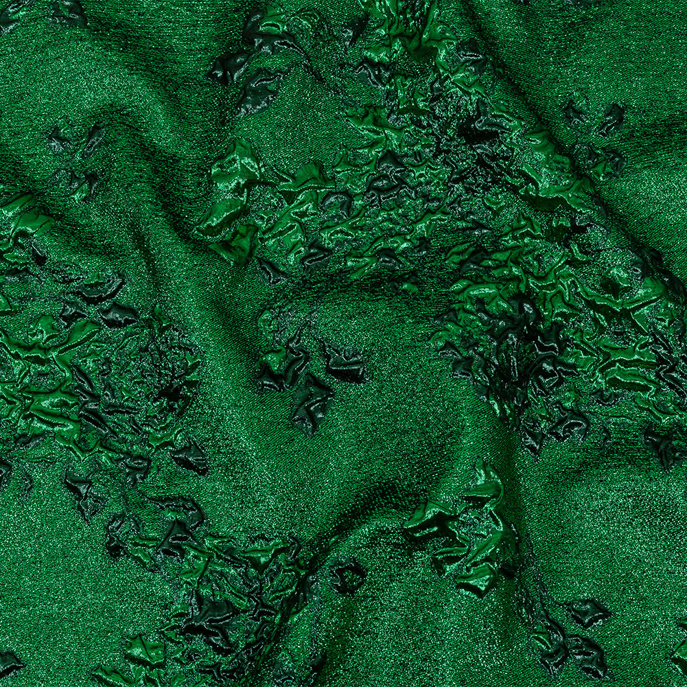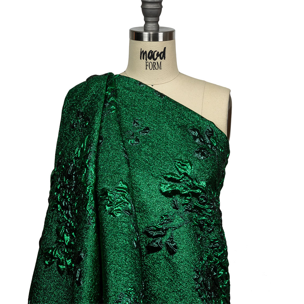 Like finding a glimmering jewel in a mine, Mood’s Metallic Emerald and Forest Floral Luxury Brocade is one lucky find! Textural puckers, in shades of emerald and forest green, form abstracted florals, blooming throughout a crackled, glittery face.